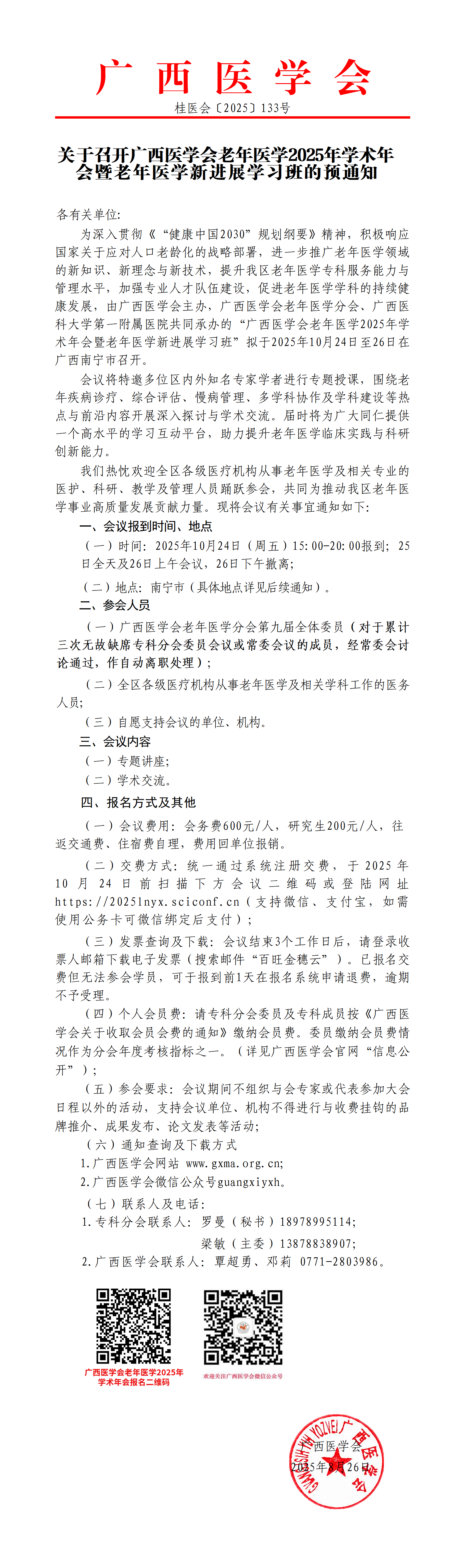 关于召开广西医学会老年医学2025年学术年会暨老年医学新进展学习班的预通知