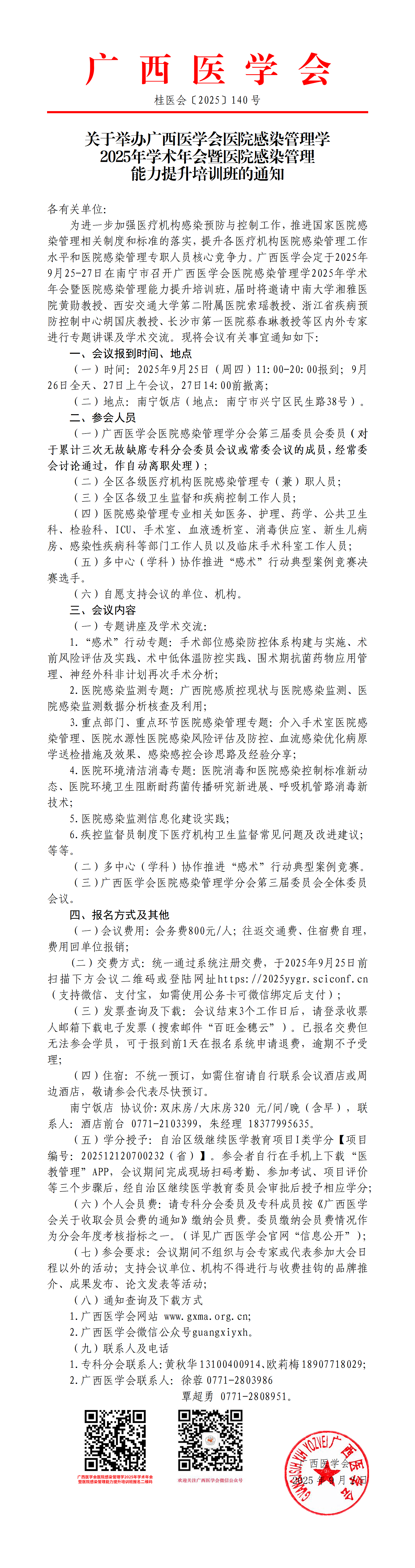 关于举办广西医学会医院感染管理学2025年学术年会暨医院感染管理能力提升培训班的通知