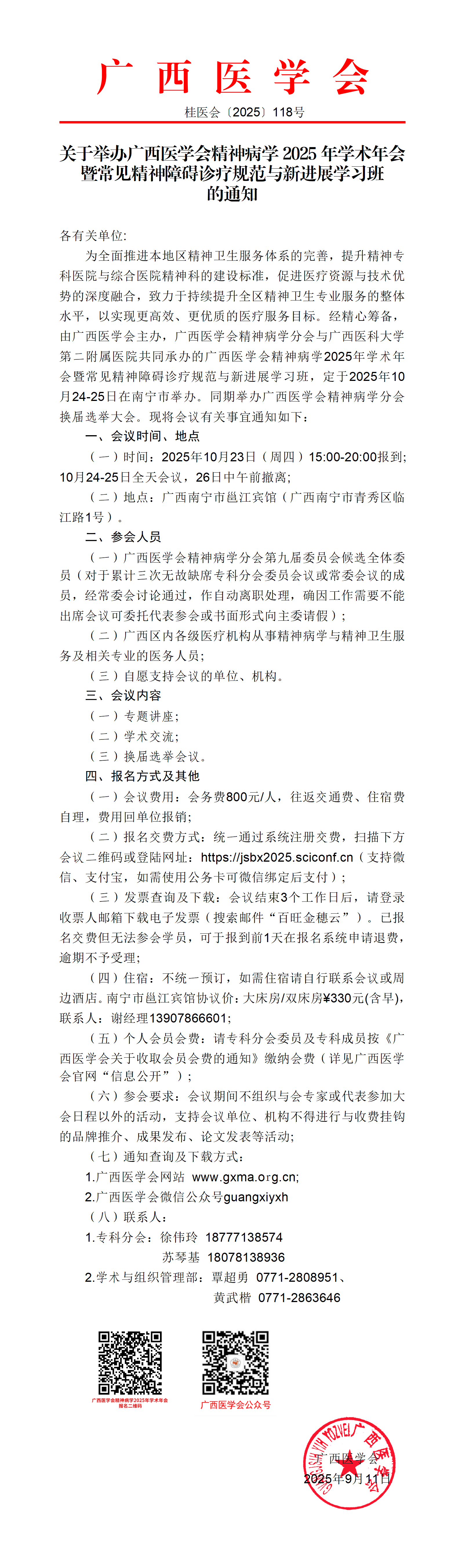 关于举办广西医学会精神病学2025年学术年会暨常见精神障碍诊疗规范与新进展学习班 的通知