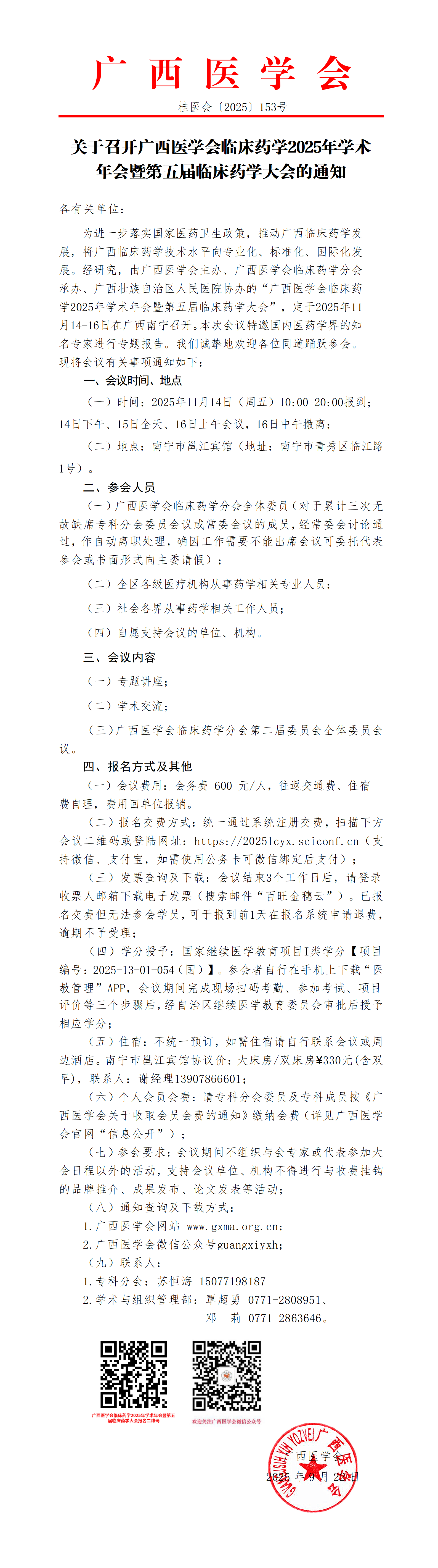 关于召开广西医学会临床药学2025年学术年会暨第五届临床药学大会的通知