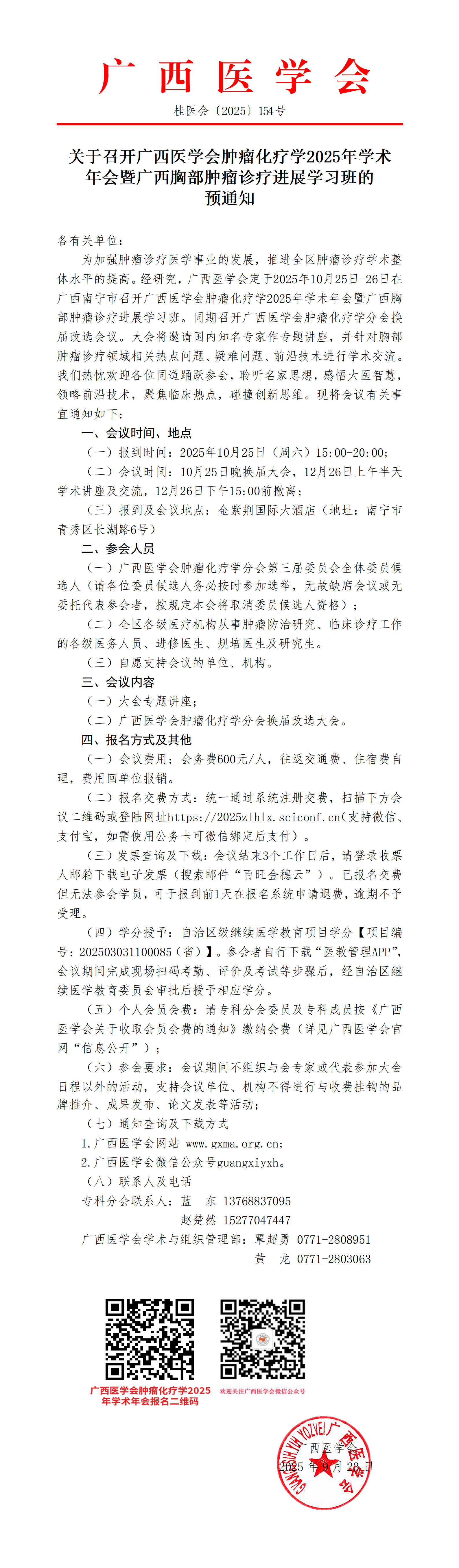 关于召开广西医学会肿瘤化疗学2025年学术年会暨广西胸部肿瘤诊疗进展学习班的预通知