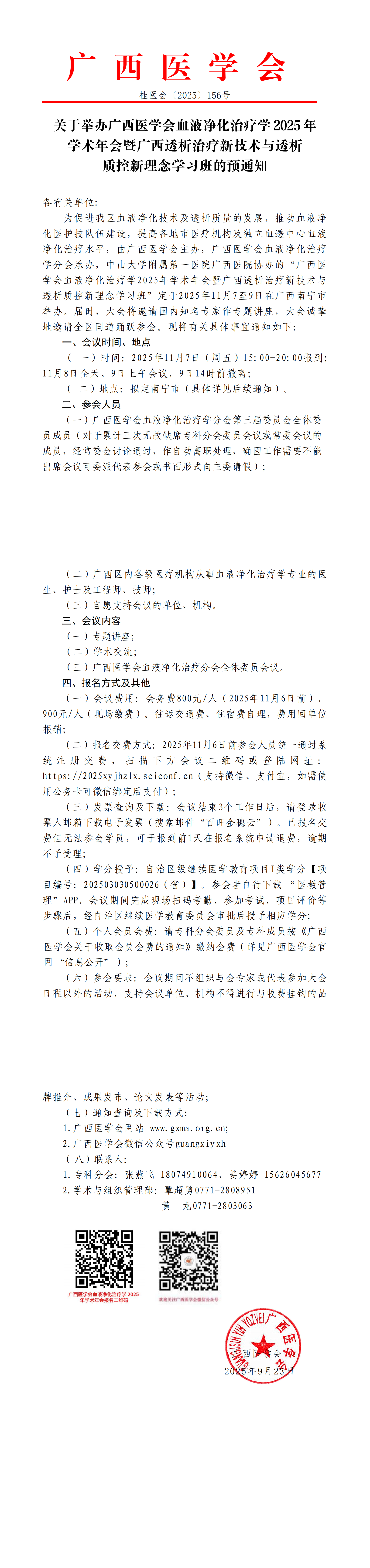 关于举办广西医学会血液净化治疗学2025年学术年会暨广西透析治疗新技术与透析质控新理念学习班的预通知