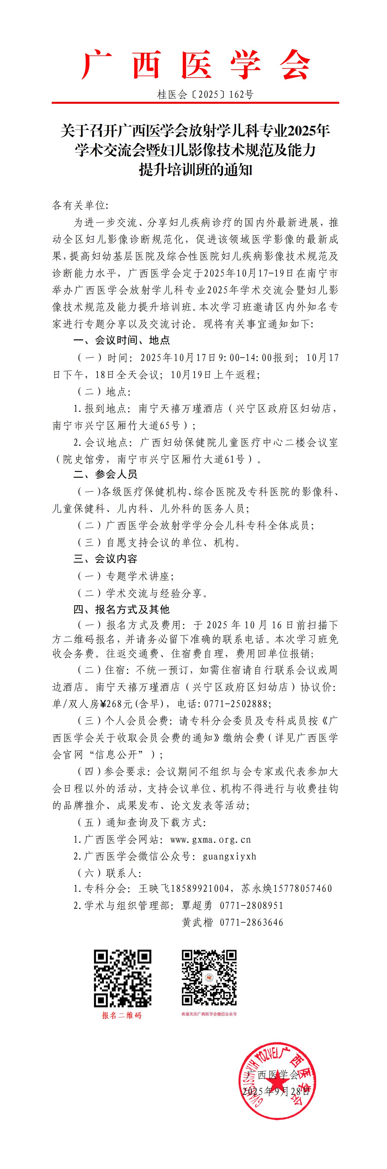 关于召开广西医学会放射学儿科专业2025年学术交流会暨妇儿影像技术规范及能力提升培训班的通知