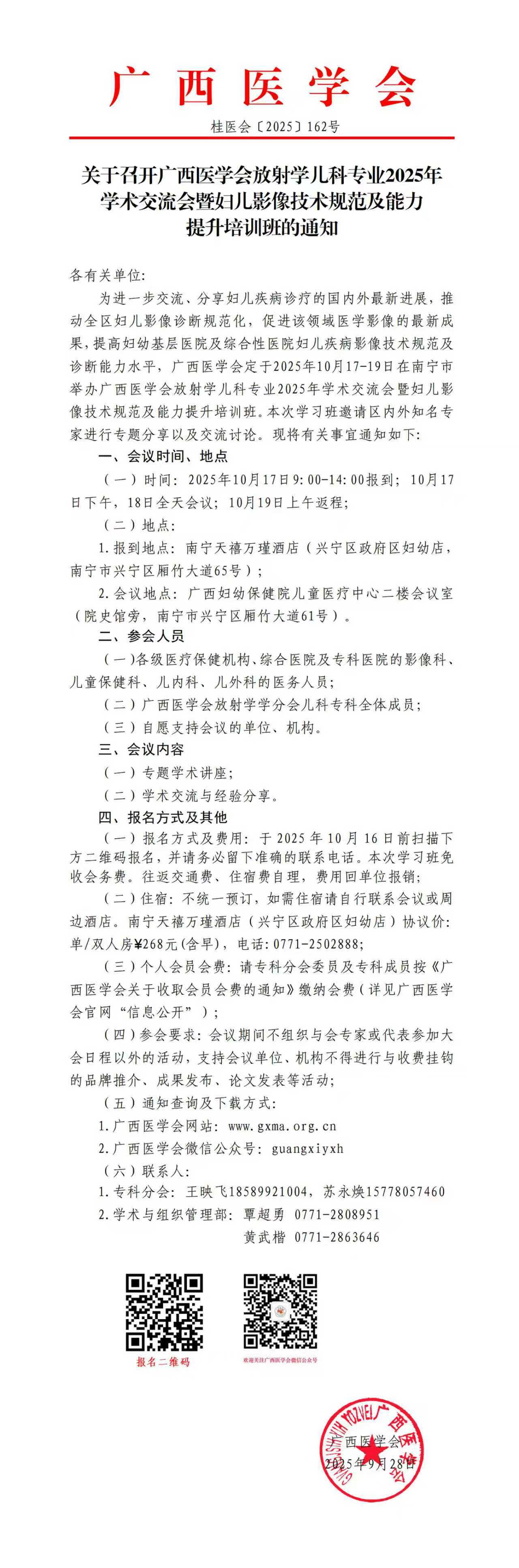 关于召开广西医学会放射学儿科专业2025年学术交流会暨妇儿影像技术规范及能力提升培训班的通知