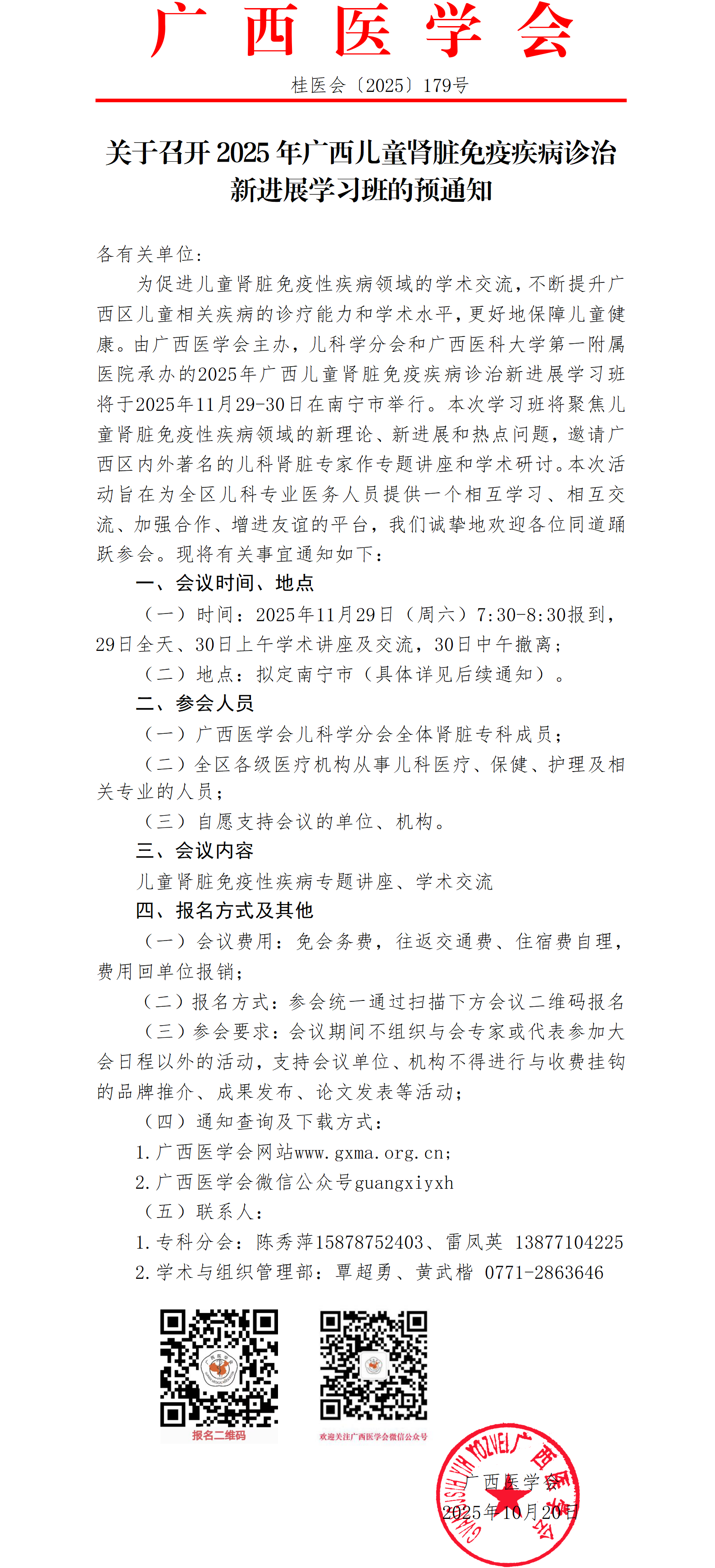 关于召开2025年广西儿童肾脏免疫疾病诊治新进展学习班的预通知