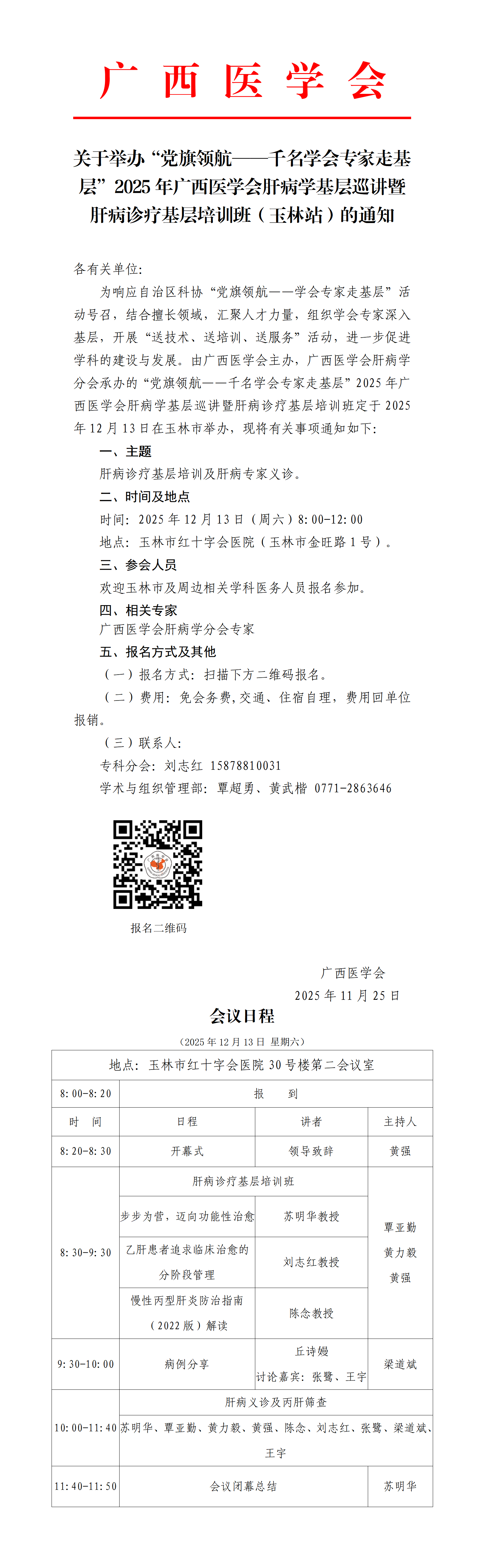 关于举办“党旗领航——千名学会专家走基层”2025年广西医学会肝病学基层巡讲暨肝病诊疗基层培训班(玉林站)的通知