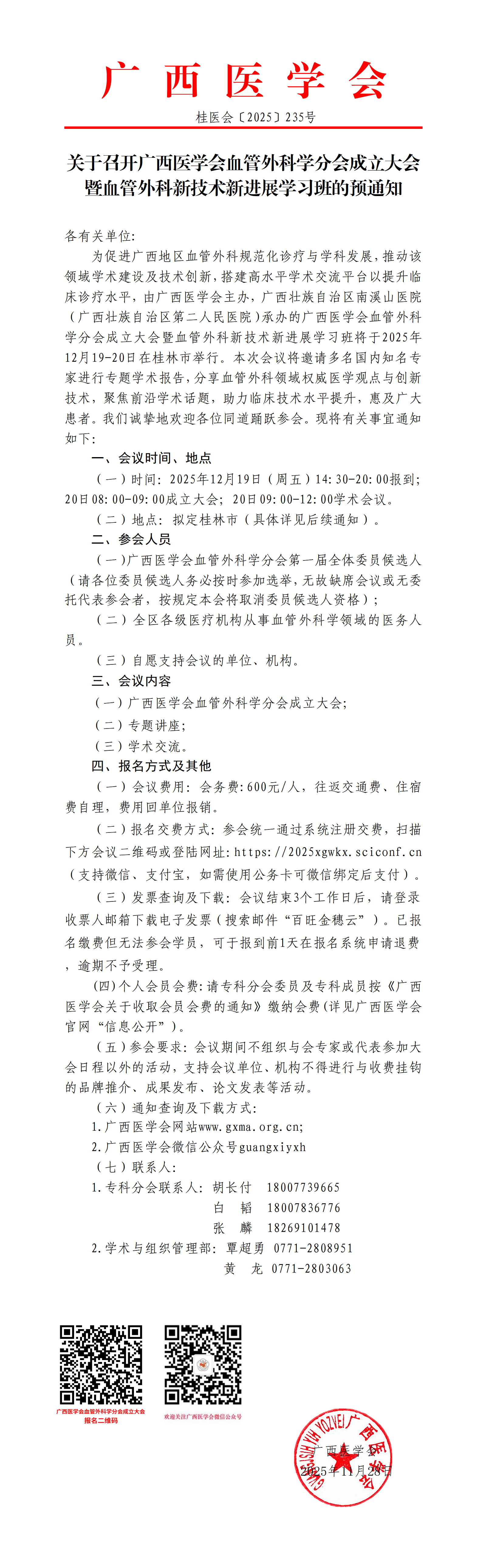 关于召开广西医学会血管外科学分会成立大会暨血管外科新技术新进展学习班的预通知