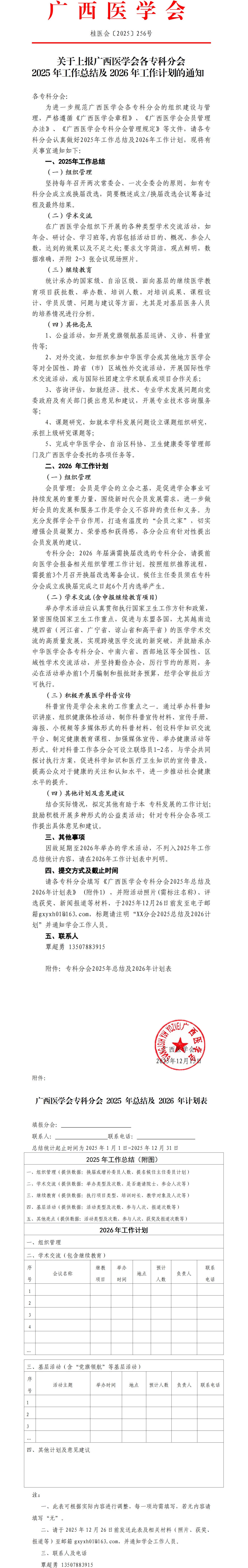 关于上报广西医学会各专科分会2025 年工作总结及 2026 年工作计划的通知