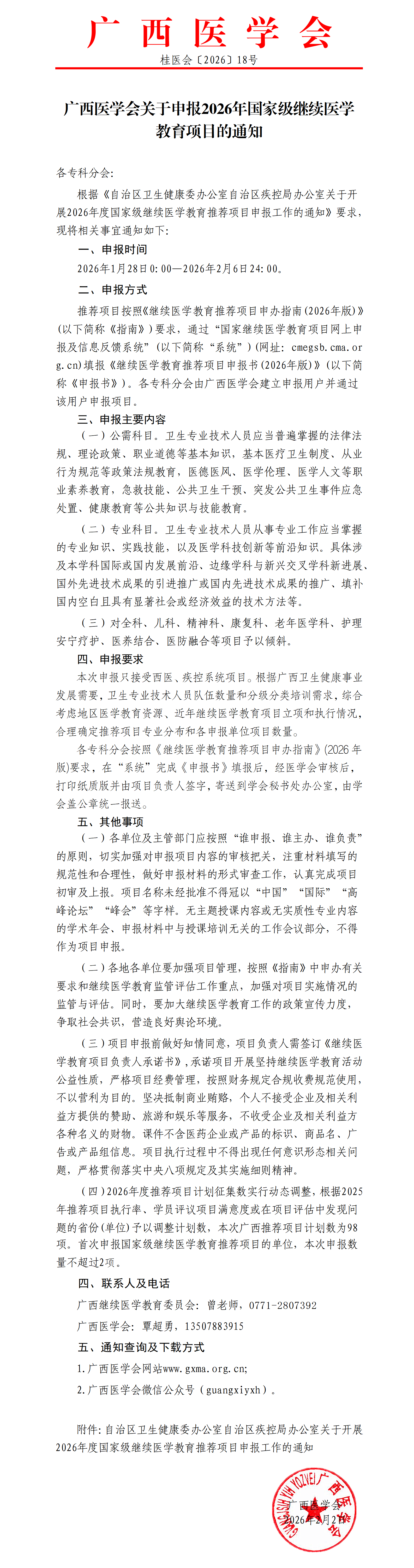 广西医学会关于申报2026年国家级继续医学教育项目的通知