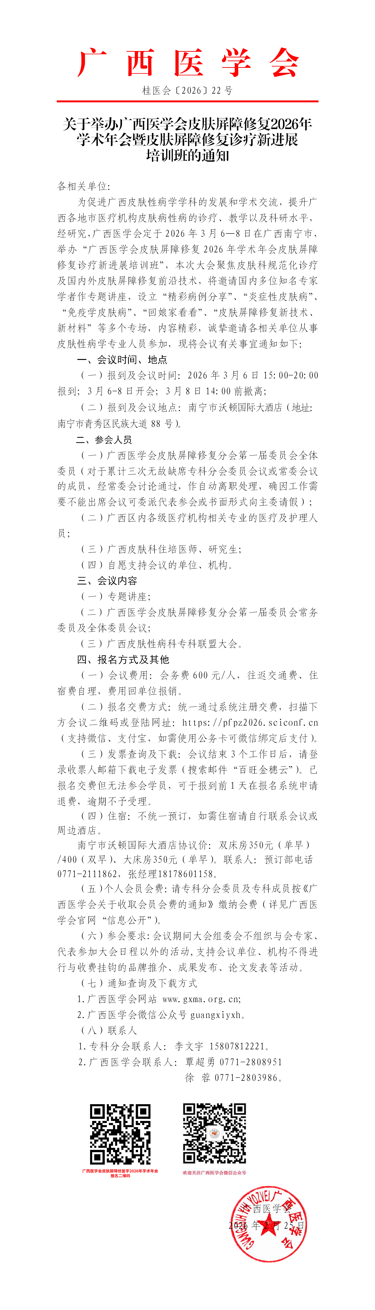 关于举办广西医学会皮肤屏障修复2026年学术年会暨皮肤屏障修复诊疗新进展培训班的通知