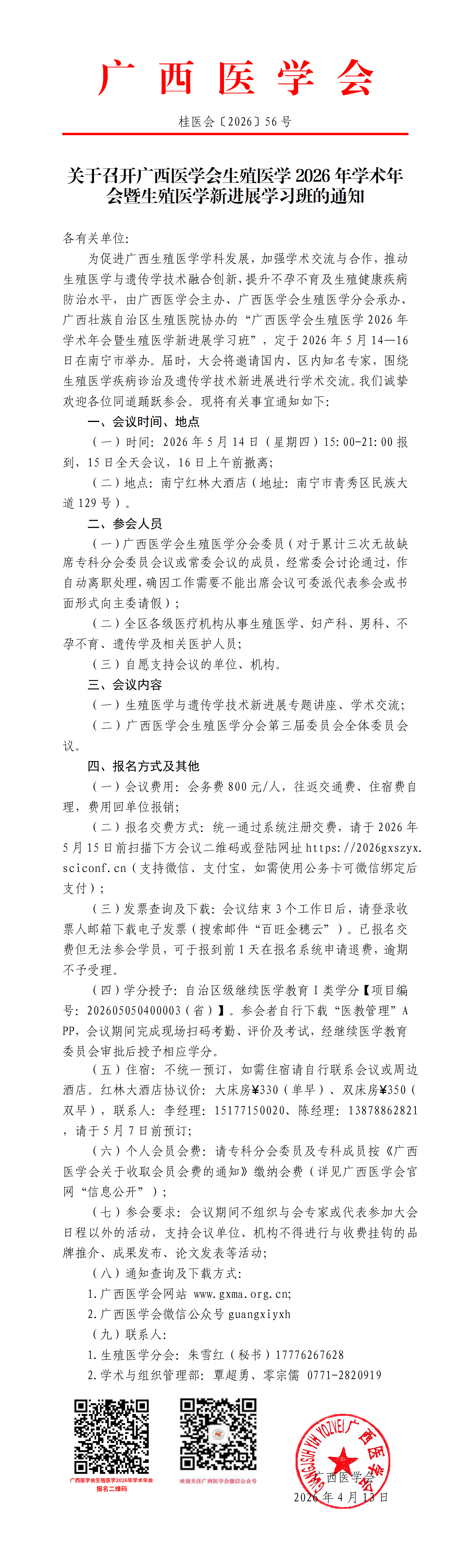 关于召开广西医学会生殖医学2026年学术年会暨生殖医学新进展学习班的通知