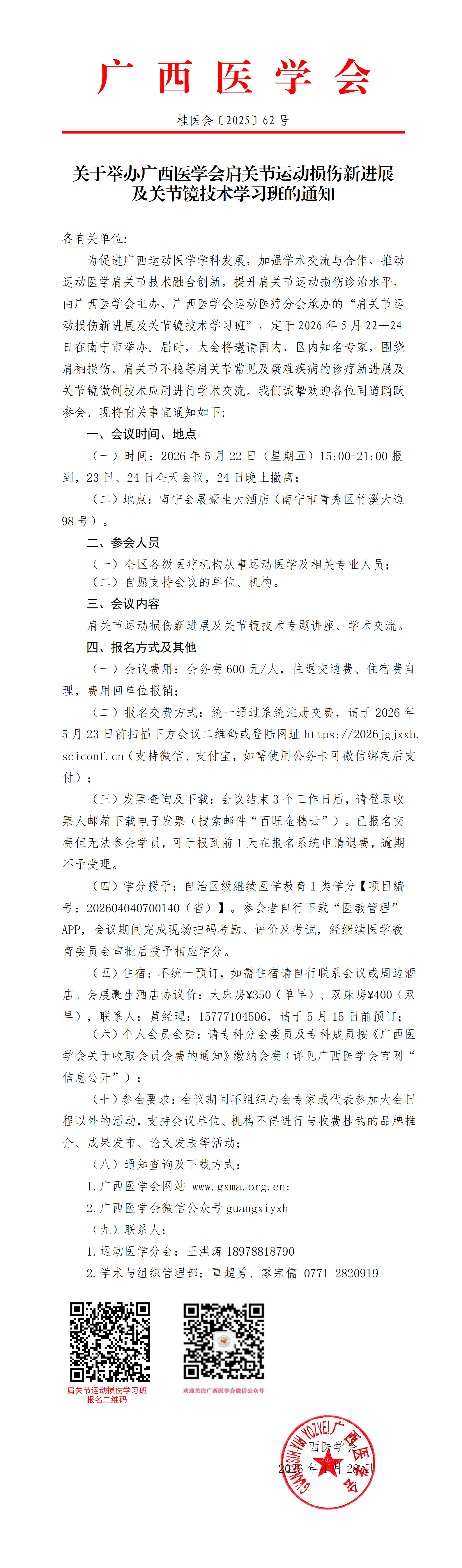 关于举办广西医学会肩关节运动损伤新进展及关节镜技术学习班的通知