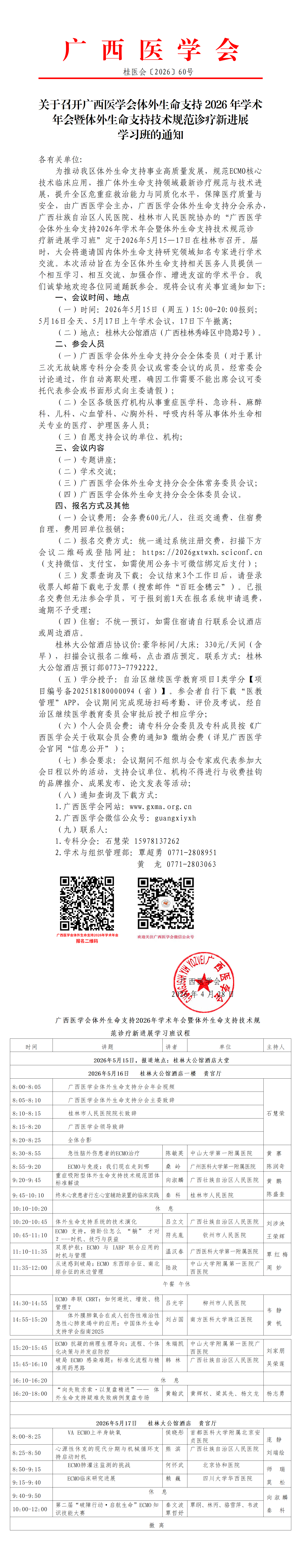 关于召开广西医学会体外生命支持2026年学术年会暨体外生命支持技术规范诊疗新进展学习班的通知