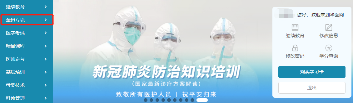 第三步:点击“继续教育”频道,选择“全员专项”,选择《广西冬春季新冠肺炎疫情防控知识培训》项目进行学习。