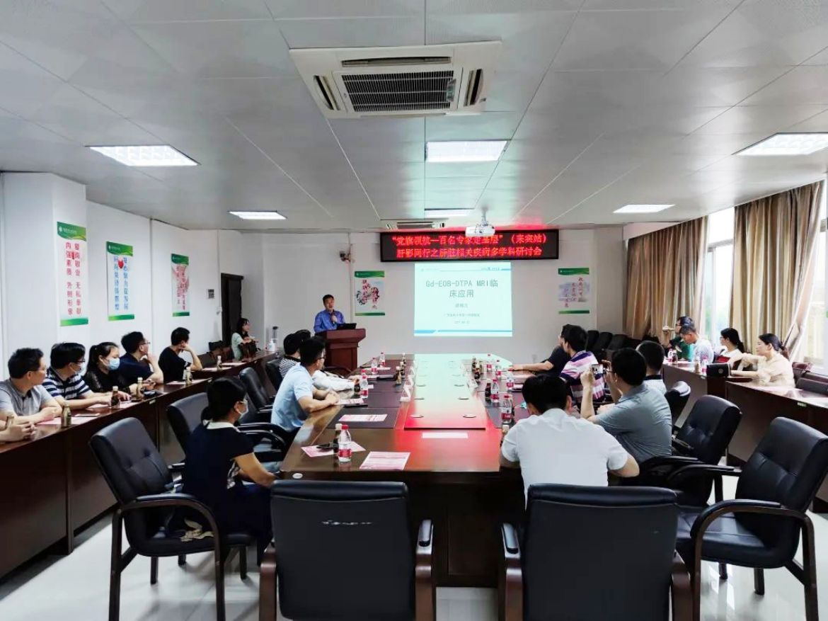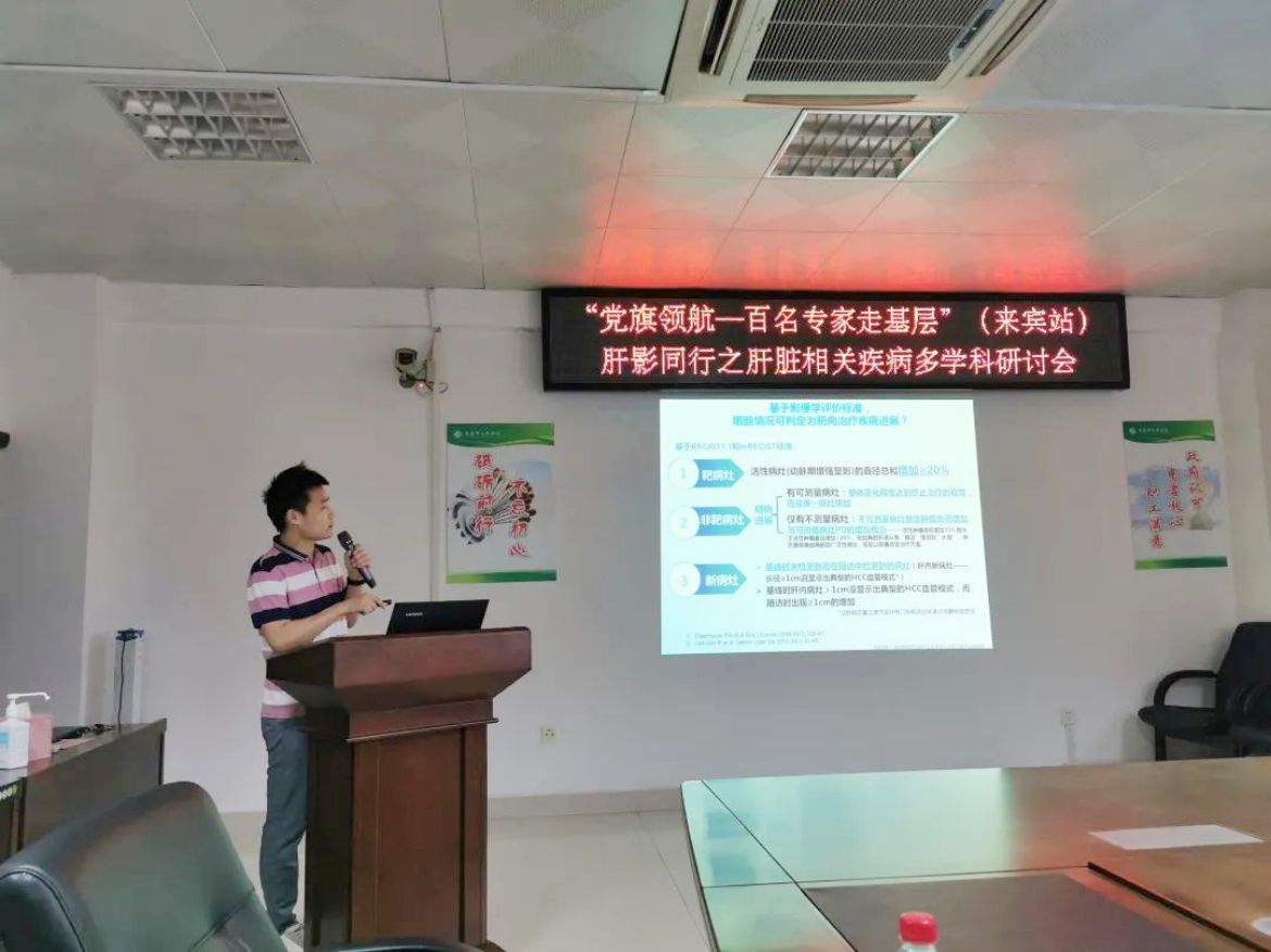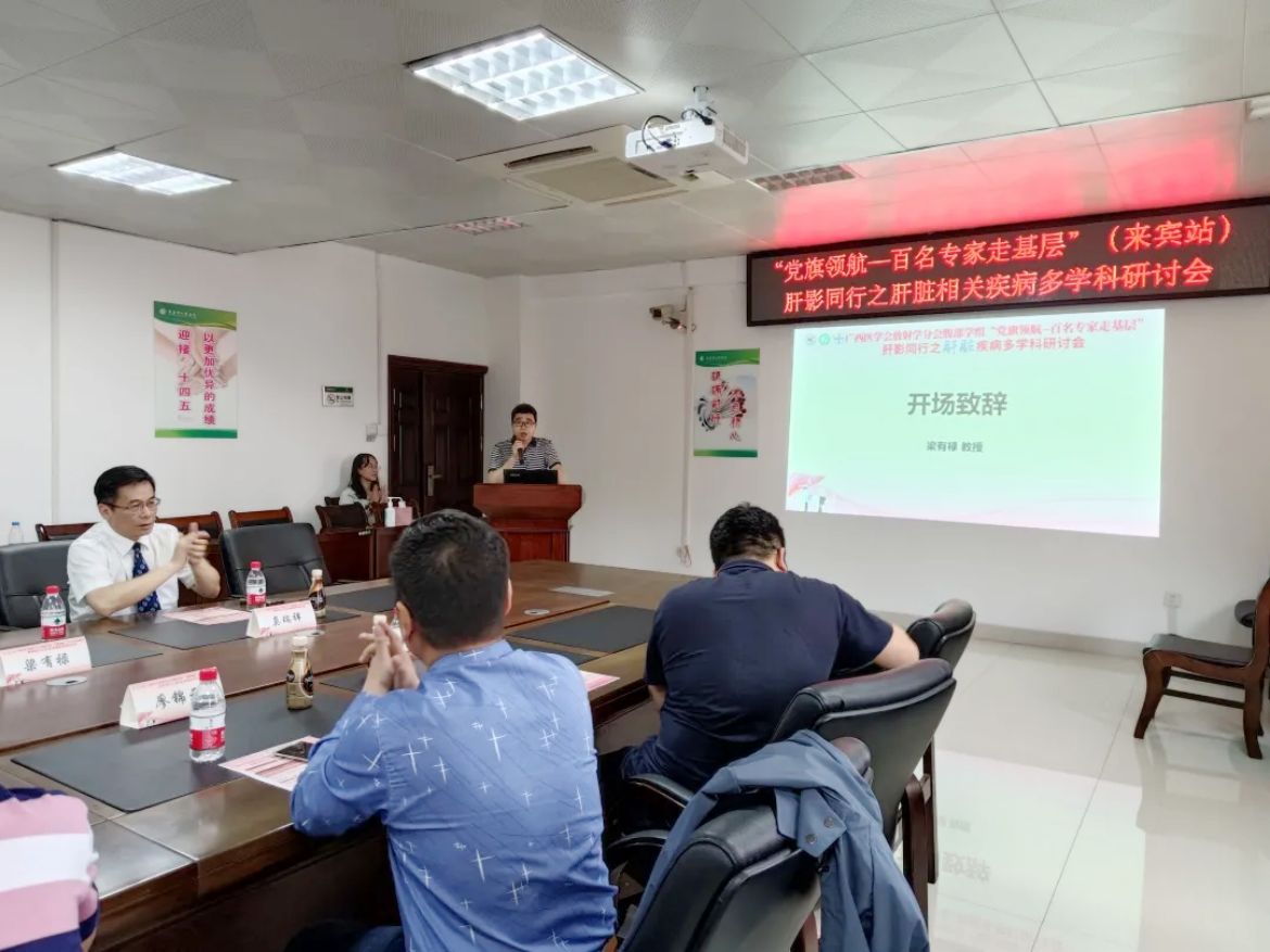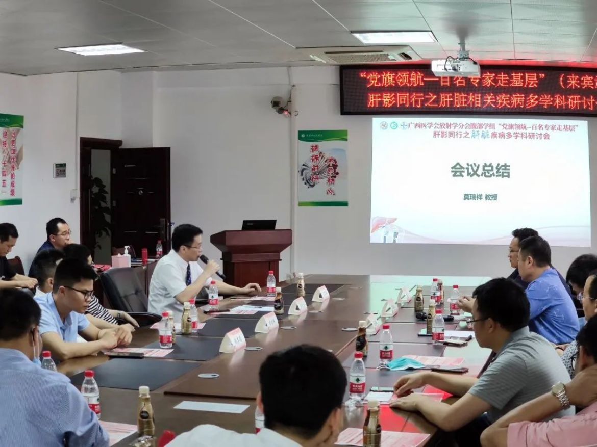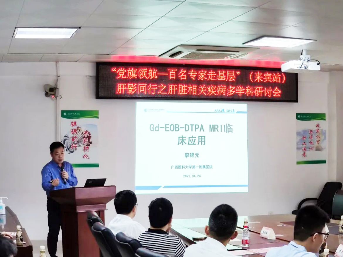 4月24日下午,广西医学会放射学分会腹部学组“党旗领航——百名专家走基层”肝影同行之肝脏疾病多学科研讨会在来宾市人民医院召开。广西医科大学第一附属医院影像科副主任廖锦元教授一行三人到来宾市人民医院传经送宝。来宾市人民医院放射科、肝胆胰脾疝外科等临床医技科室及市直其他医疗机构相关医务人员参会学习。来宾市人民医院放射科主任梁有禄主持此次会议。