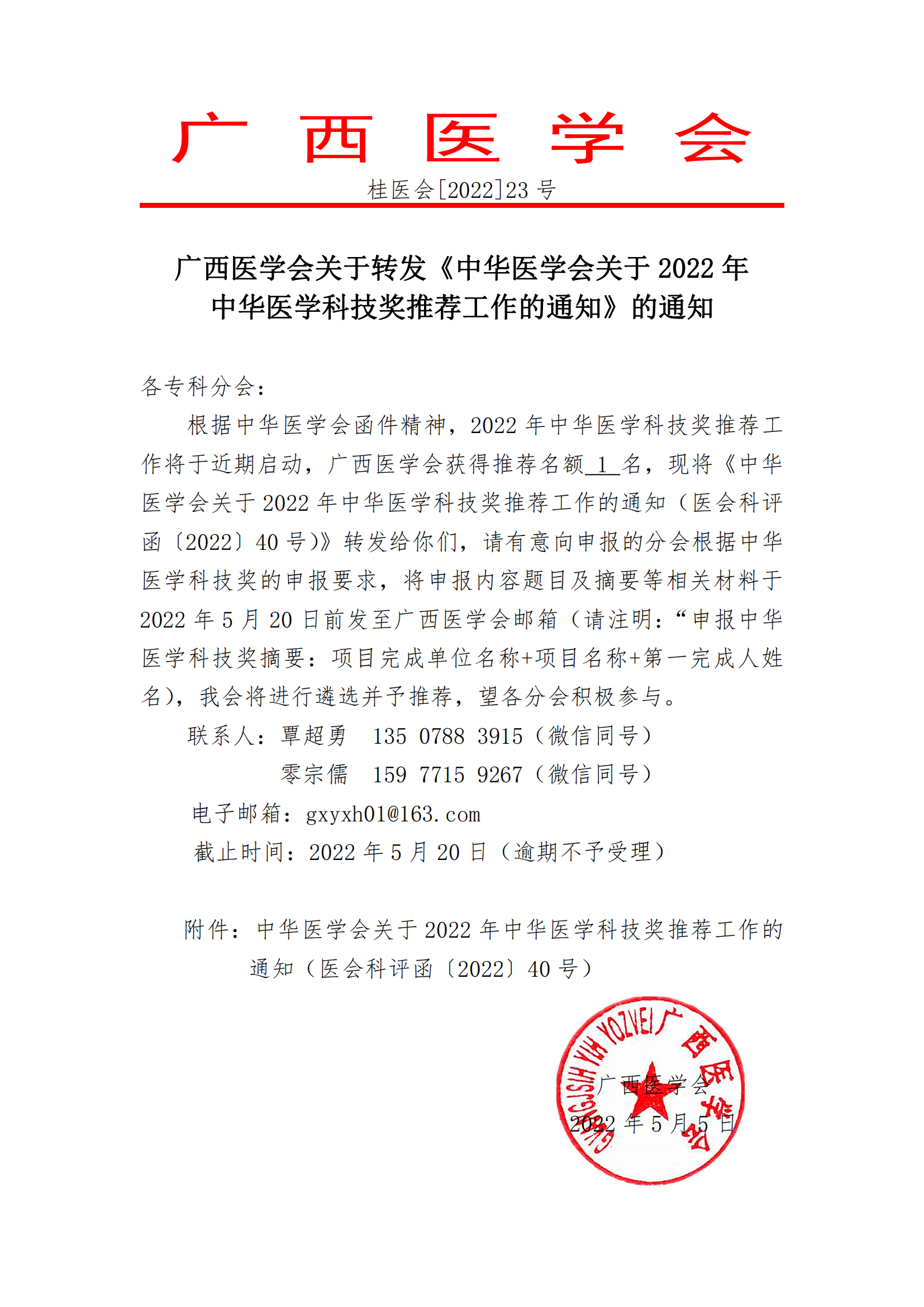 广西医学会关于转发《中华医学会关于 2022 年 中华医学科技奖推荐工作的通知》的通知
