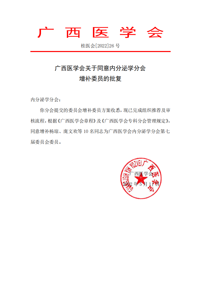 广西医学会关于同意内分泌学分会 增补委员的批复