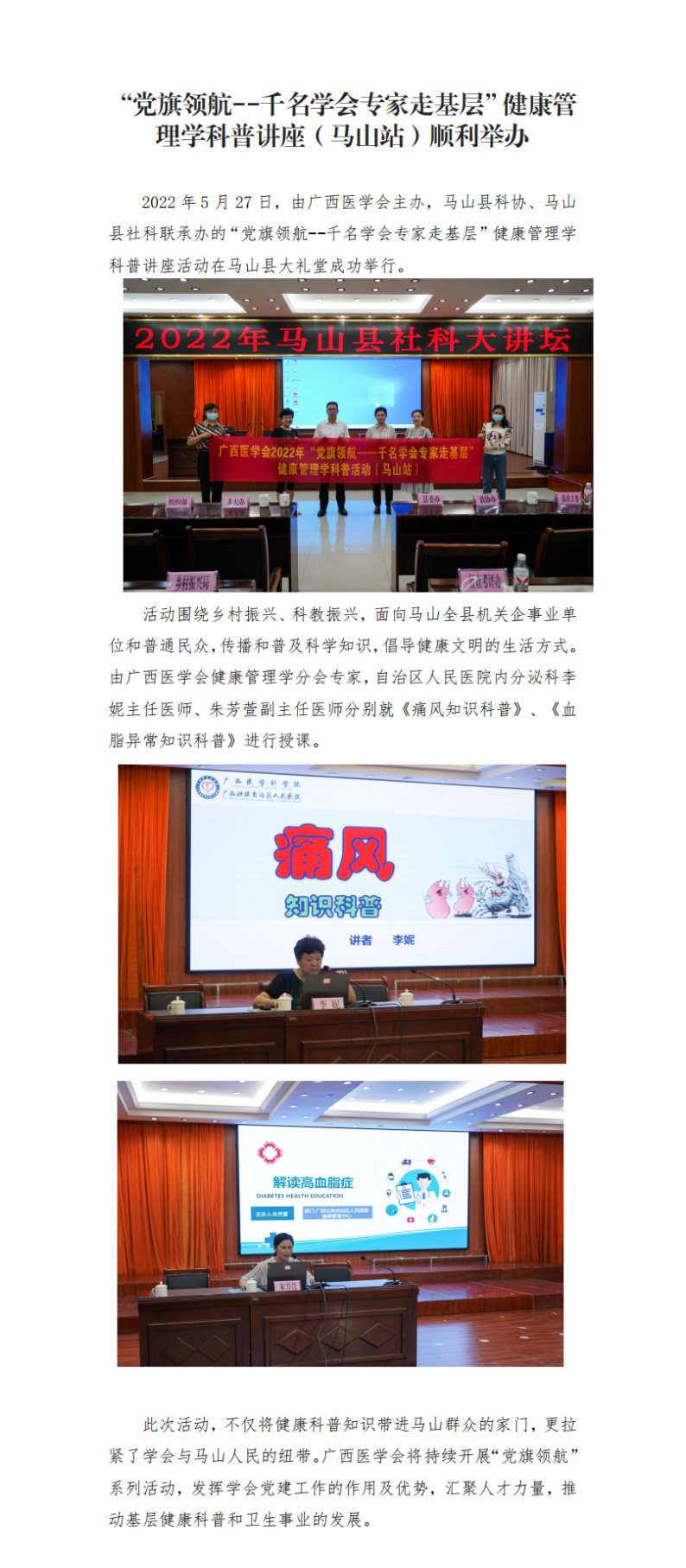 “党旗领航--千名学会专家走基层”健康管理学科普讲座(马山站)顺利举办
