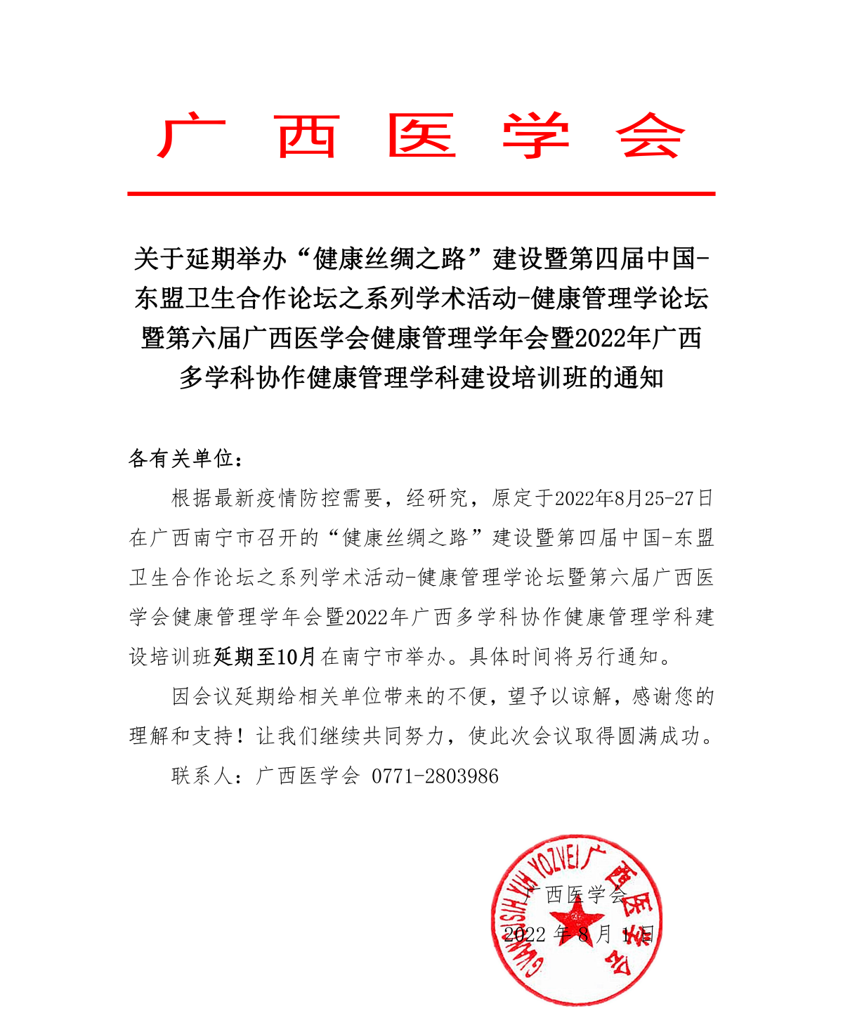 关于延期举办“健康丝绸之路”建设暨第四届中国- 东盟卫生合作论坛之系列学术活动-健康管理学论坛 暨第六届广西医学会健康管理学年会暨2022年广西 多学科协作健康管理学科建设培训班的通知