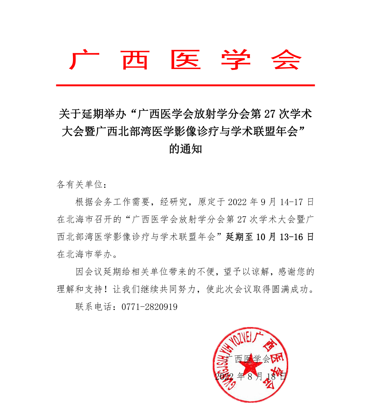 关于延期举办“广西医学会放射学分会第27次学术大会暨广西北部湾医学影像诊疗与学术联盟年会” 的通知