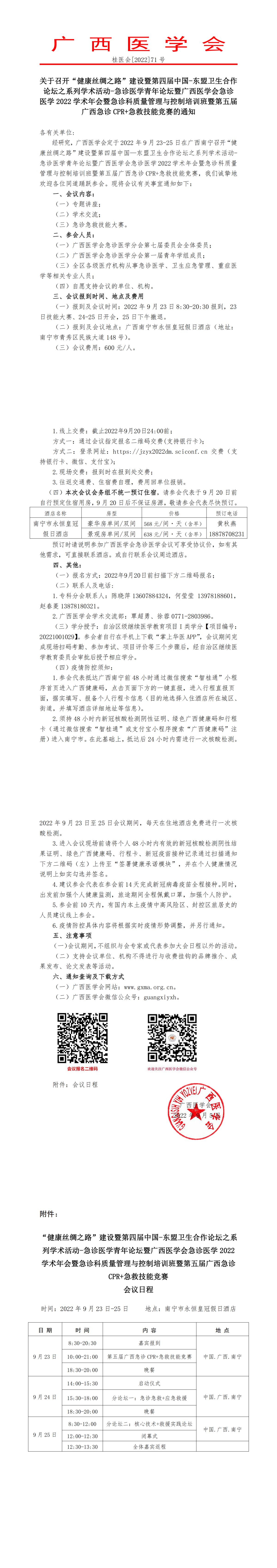 关于召开“健康丝绸之路”建设暨第四届中国-东盟卫生合作论坛之系列学术活动-急诊医学青年论坛暨广西医学会急诊医学2022学术年会暨急诊科质量管理与控制培训班暨第五届广西急诊CPR+急救技能竞赛的通知