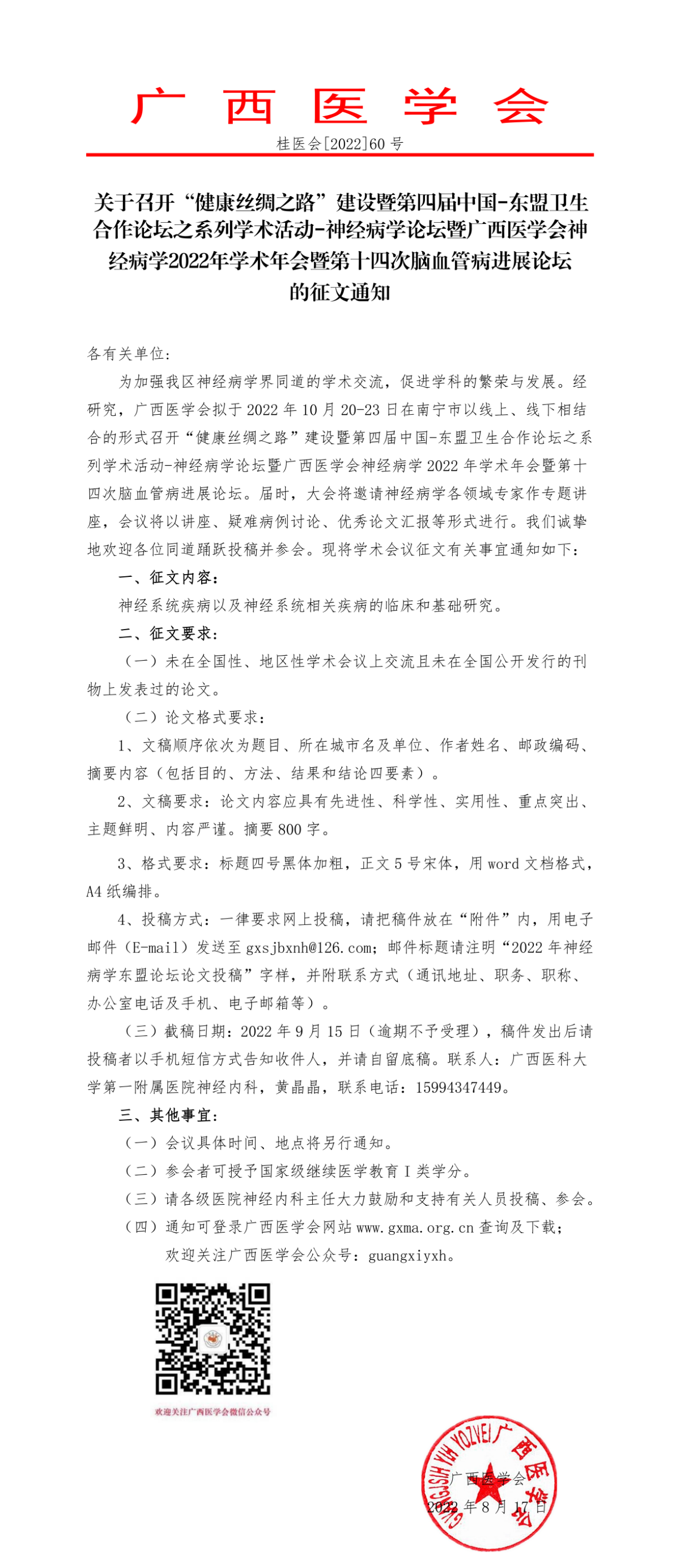 关于召开“健康丝绸之路”建设暨第四届中国-东盟卫生 合作论坛之系列学术活动-神经病学论坛暨广西医学会神经病学2022年学术年会暨第十四次脑血管病进展论坛的征文通知