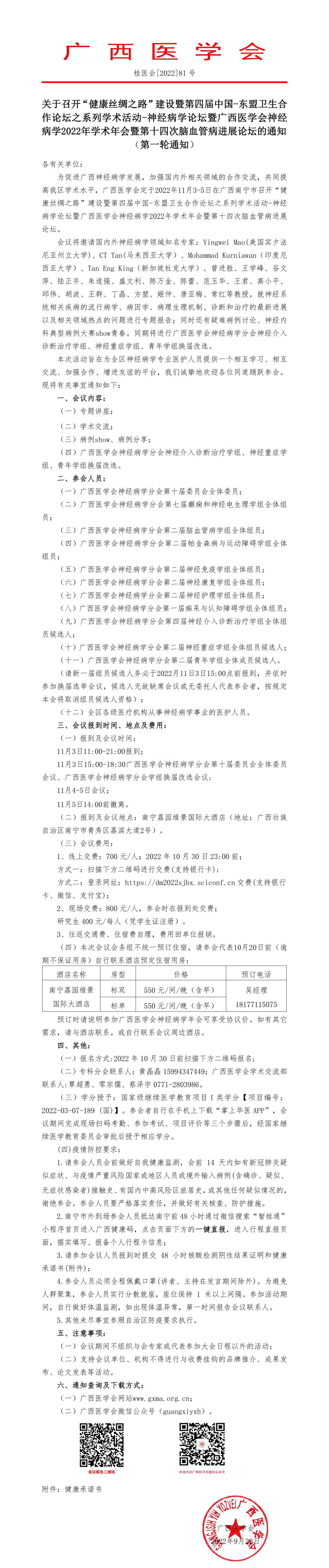 关于召开“健康丝绸之路”建设暨第四届中国-东盟卫生合作论坛之系列学术活动-神经病学论坛暨广西医学会神经病学2022年学术年会暨第十四次脑血管病进展论坛的通知(第一轮通知)
