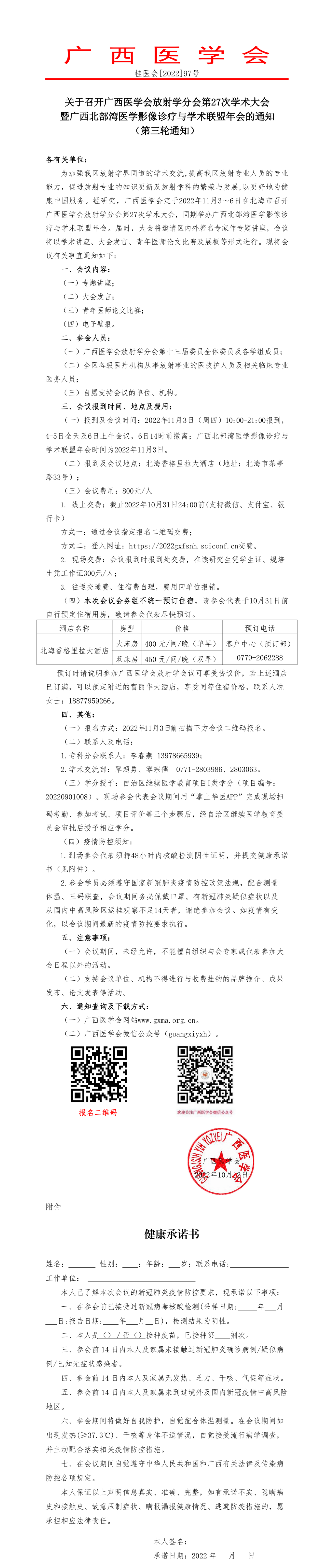 关于召开广西医学会放射学分会第27次学术大会暨广西北部湾医学影像诊疗与学术联盟年会的通知(第三轮通知)