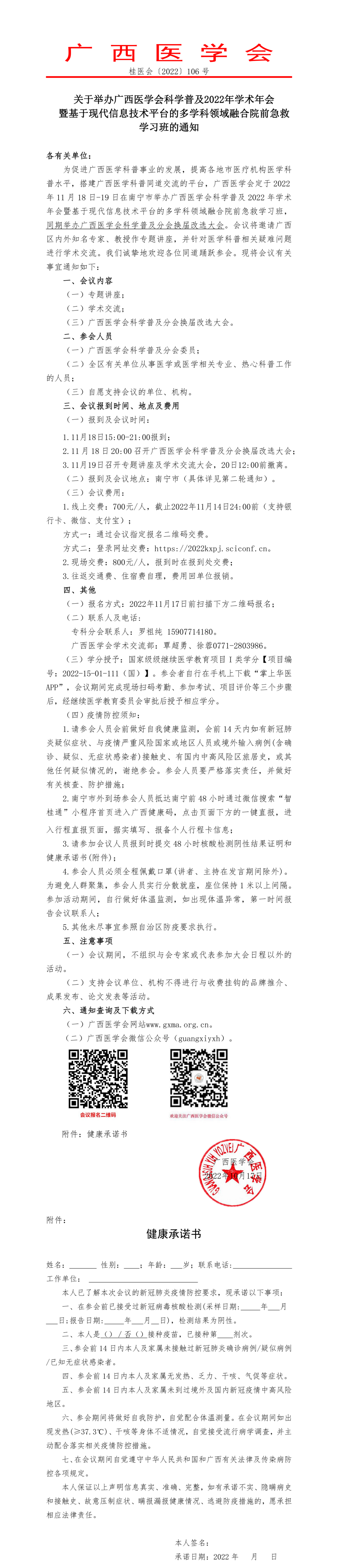 关于举办广西医学会科学普及2022年学术年会暨基于现代信息技术平台的多学科领域融合院前急救学习班的通知