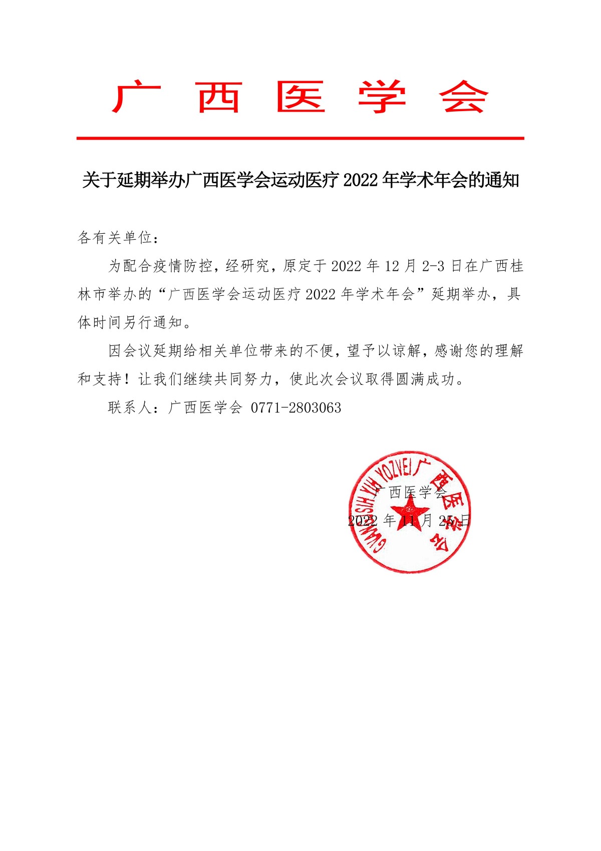 关于延期举办广西医学会运动医疗2022年学术年会的通知