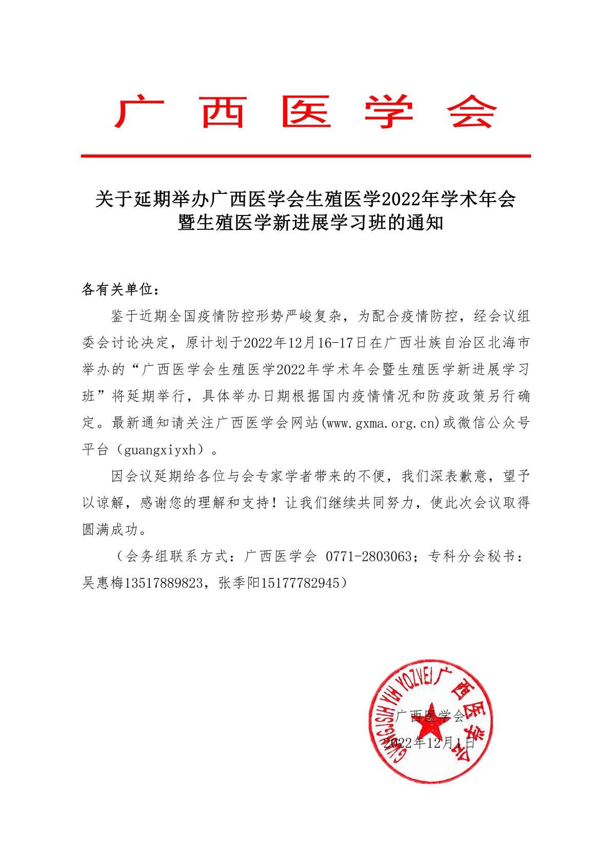 关于延期举办广西医学会生殖医学2022年学术年会暨生殖医学新进展学习班的通知