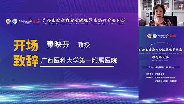 广西医科大学第一附属医院秦映芬教授作开场致辞,感谢各位专家及同仁参加本次线上会议,对本次会议以线上直播开展的形式表示充分的肯定。希望通过大家的共同交流、共同学习,不断提高区内内分泌疑难病的诊治水平,促使临床诊疗医师在临床诊疗思维上有更进一步的提高。