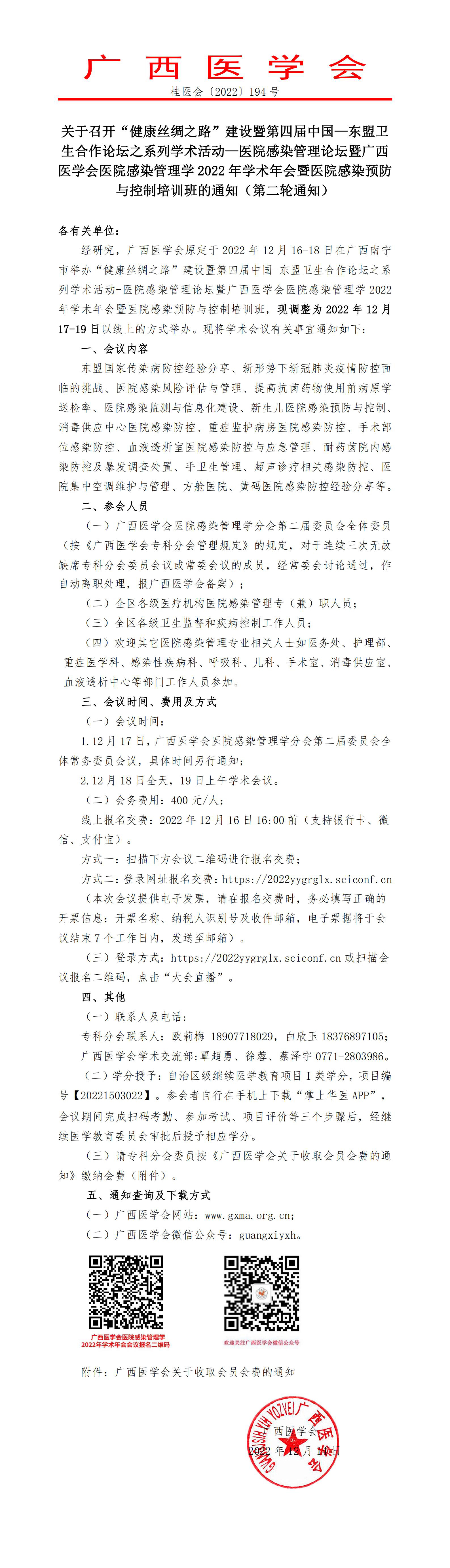 关于召开“健康丝绸之路”建设暨第四届中国—东盟卫生合作论坛之系列学术活动—医院感染管理论坛暨广西医学会医院感染管理学2022年学术年会暨医院感染预防与控制培训班的通知(第二轮通知)