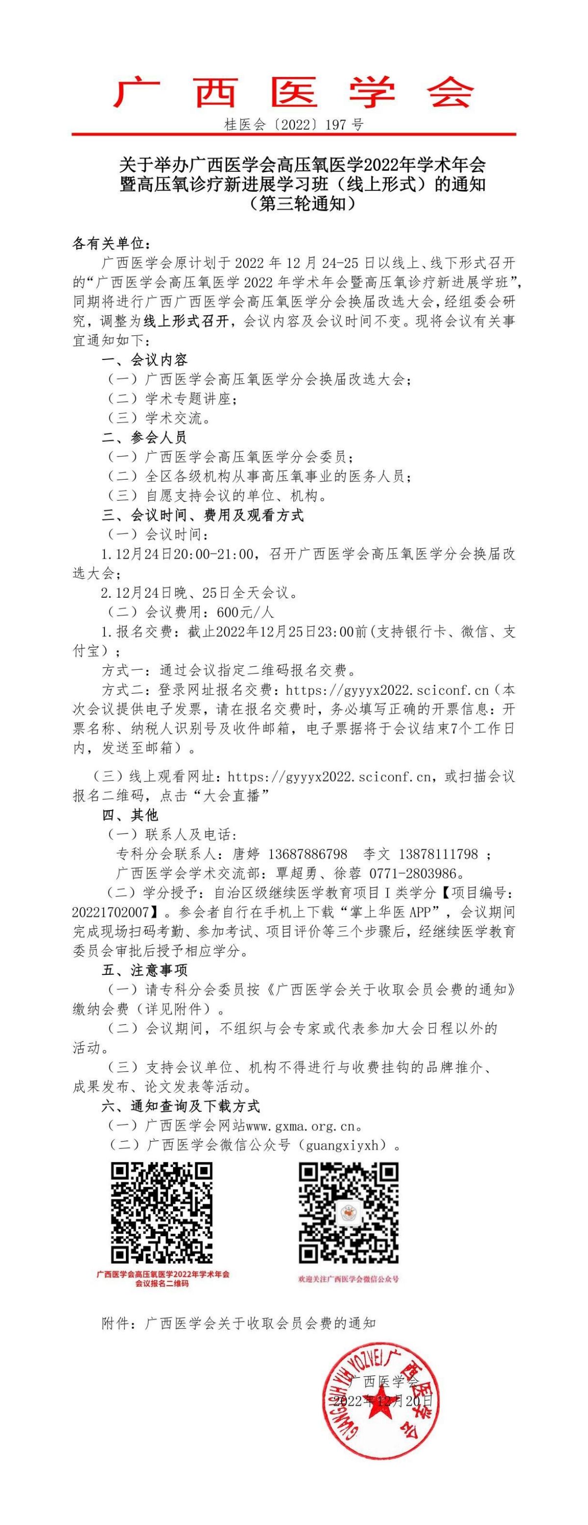 关于举办广西医学会高压氧医学2022年学术年会暨高压氧诊疗新进展学习班(线上形式)的通知(第三轮通知)