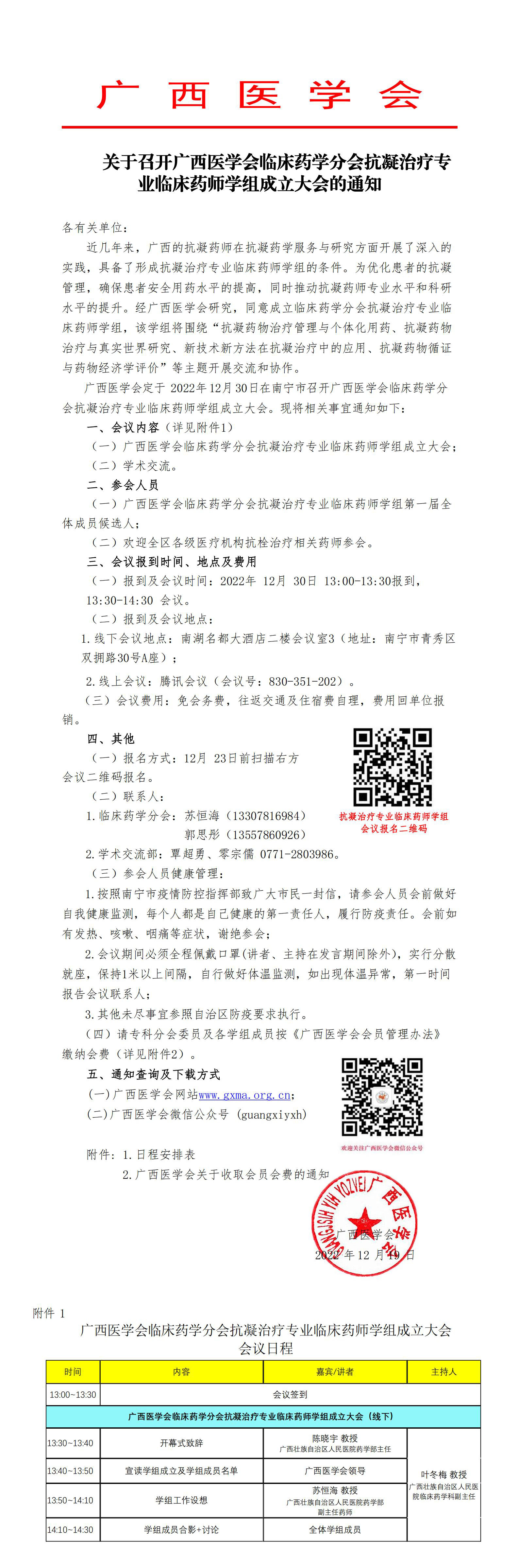 关于召开广西医学会临床药学分会抗凝治疗专业临床药师学组成立大会的通知