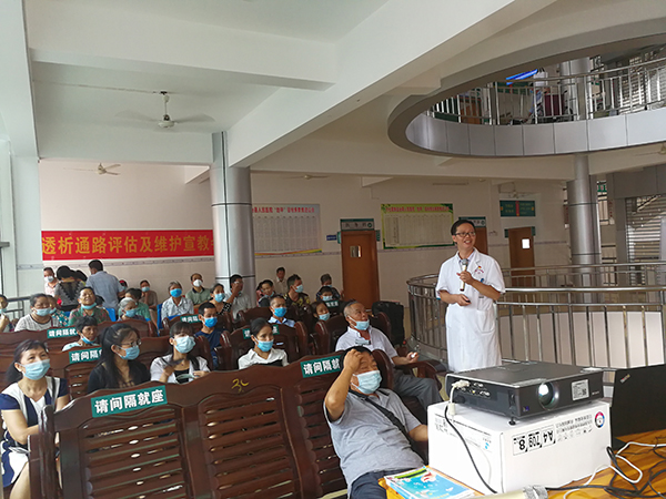 本次活动主要内容包括专家到科室进行透析通路现场超声评估指导及患者健康知识宣教会。大化县人民医院血透室韦金宏主任率团队6人参与活动组织。广西区人民医院彭小梅主任医师、王浩宇副主任医师、姚璐超声护师共为45名患者进行通路评估并提出处理或维护建议;唐盛主任医师、吴新莲副主任护师分别作题为“肾友自我管理指导”、“透析通路日常维护”的宣传讲座。近50位患者参加,普遍反馈收益匪浅。