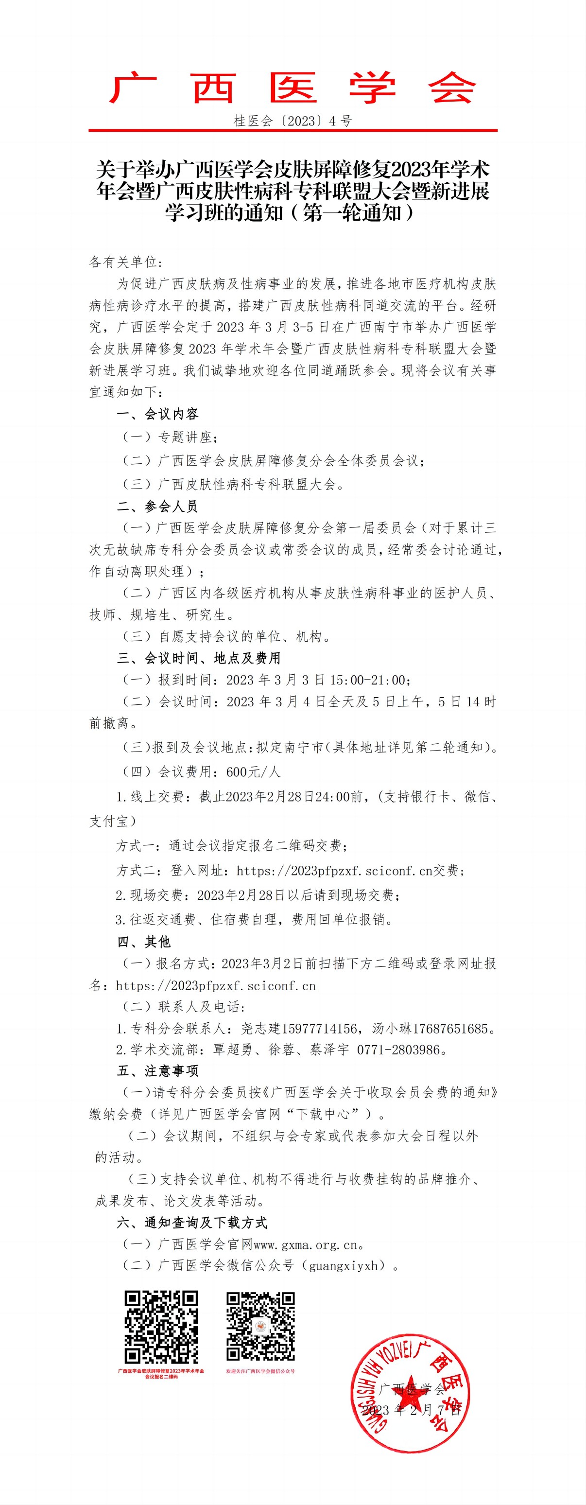 关于举办广西医学会皮肤屏障修复2023年学术年会暨广西皮肤性病科专科联盟大会暨新进展学习班的通知(第一轮通知)