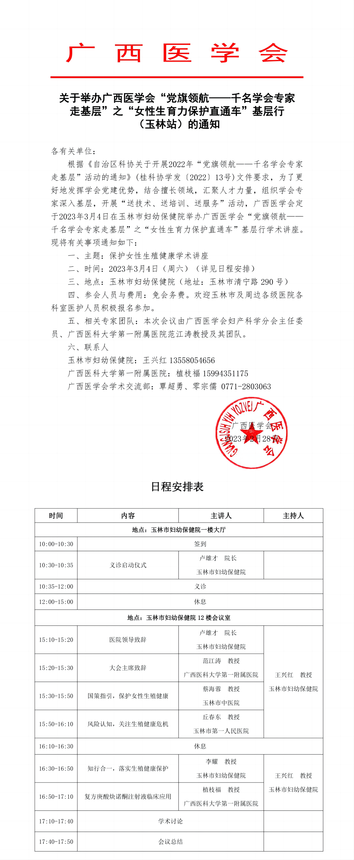 关于举办广西医学会“党旗领航——千名学会专家走基层”之“女性生育力保护直通车”基层行(玉林站)的通知