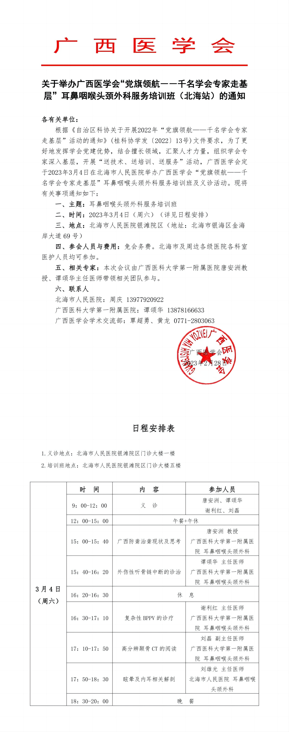 关于举办广西医学会“党旗领航——千名学会专家走基层”耳鼻咽喉头颈外科服务培训班(北海站)的通知