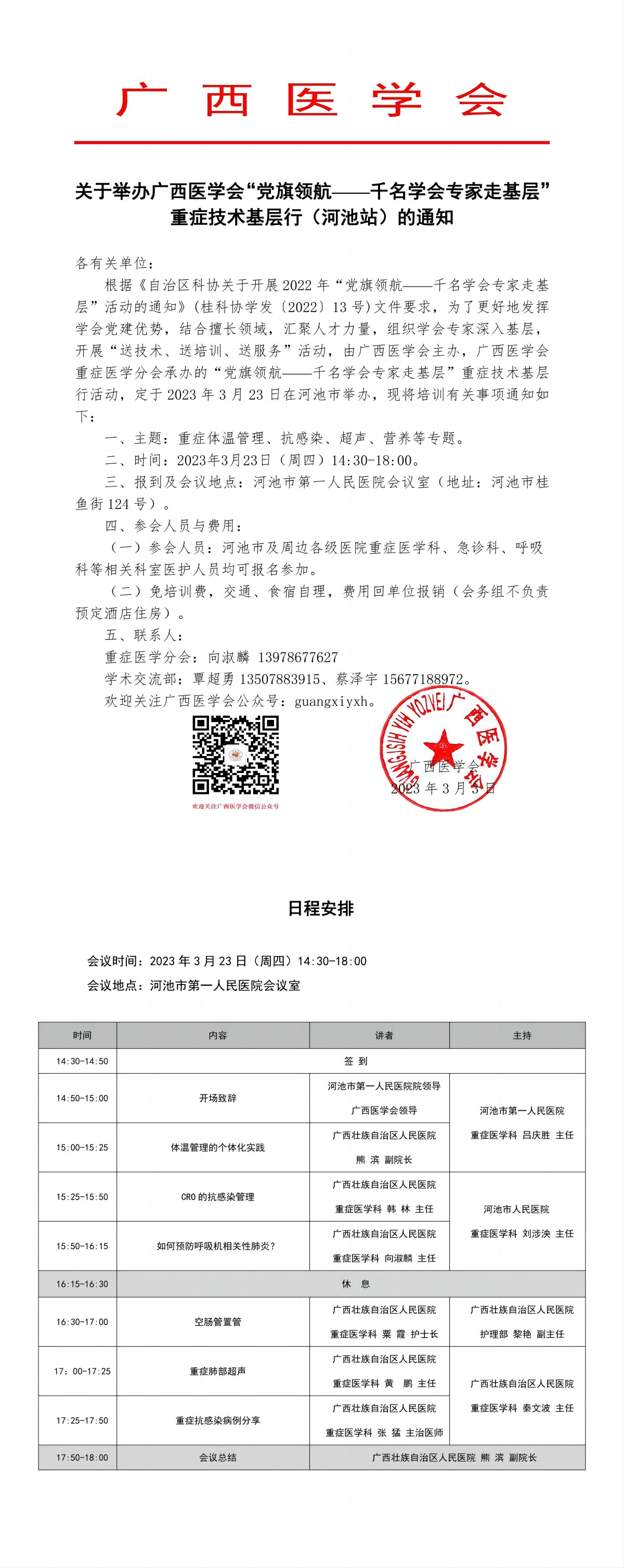 关于举办广西医学会“党旗领航——千名学会专家走基层” 重症技术基层行(河池站)的通知