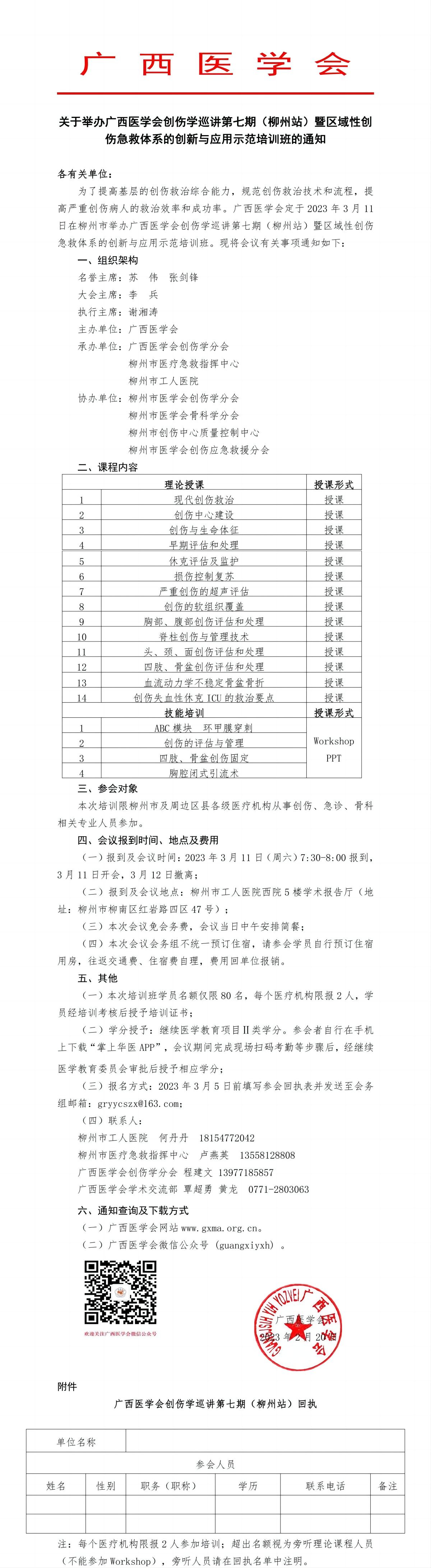关于举办广西医学会创伤学巡讲第七期(柳州站)暨区域性创伤急救体系的创新与应用示范培训班的通知