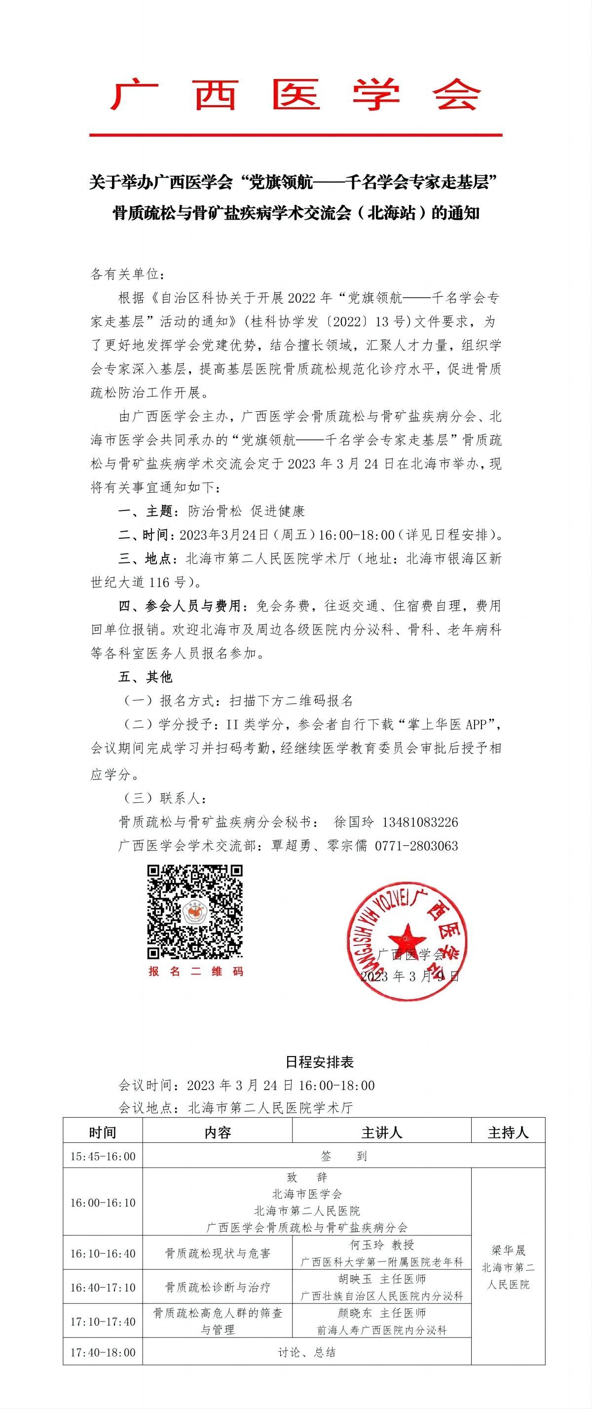 关于举办广西医学会“党旗领航——千名学会专家走基层”骨质疏松与骨矿盐疾病学术交流会(北海站)的通知