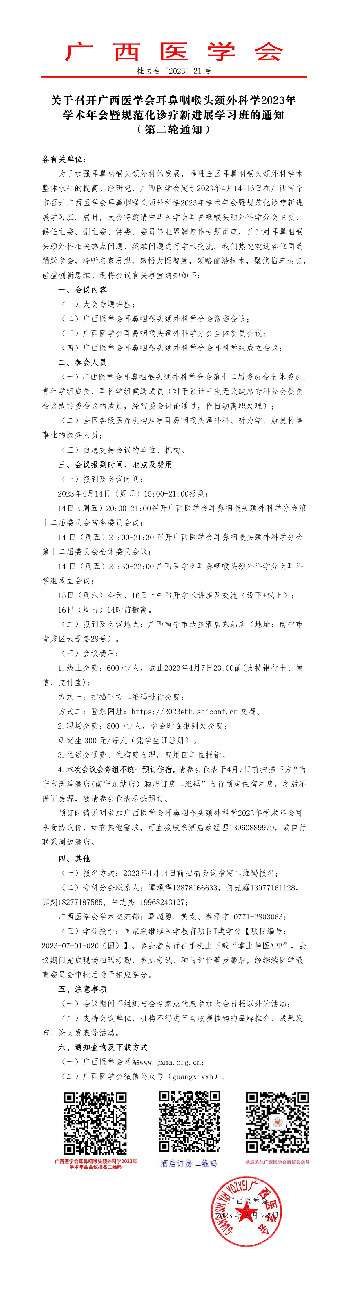 关于召开广西医学会耳鼻咽喉头颈外科学2023年学术年会暨规范化诊疗新进展学习班的通知 (第二轮通知)
