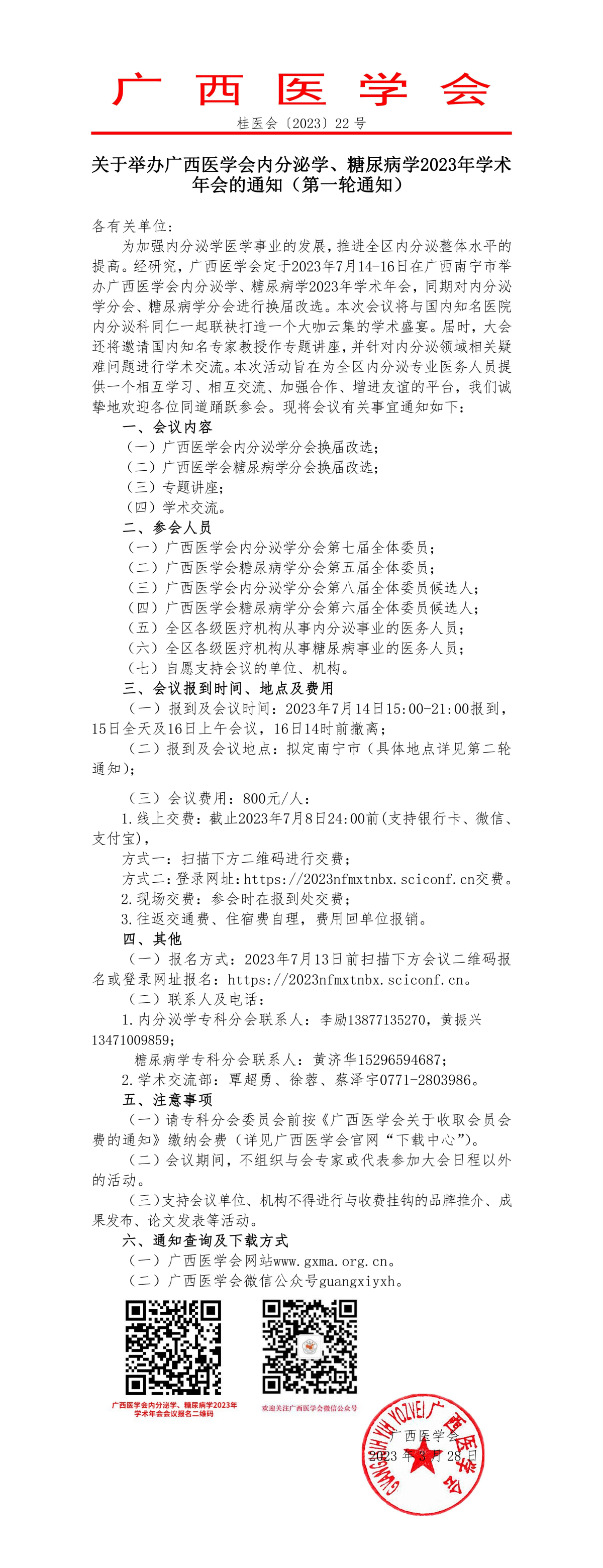 关于举办广西医学会内分泌学、糖尿病学2023年学术年会的通知(第一轮通知)