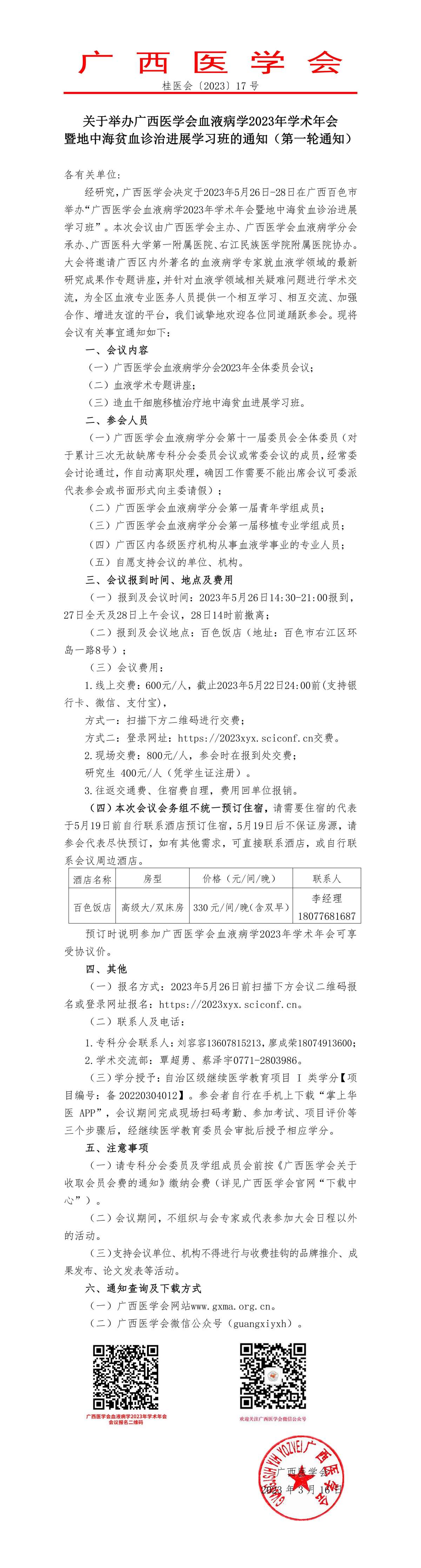 关于举办广西医学会血液病学2023年学术年会暨地中海贫血诊治进展学习班的通知(第一轮通知)