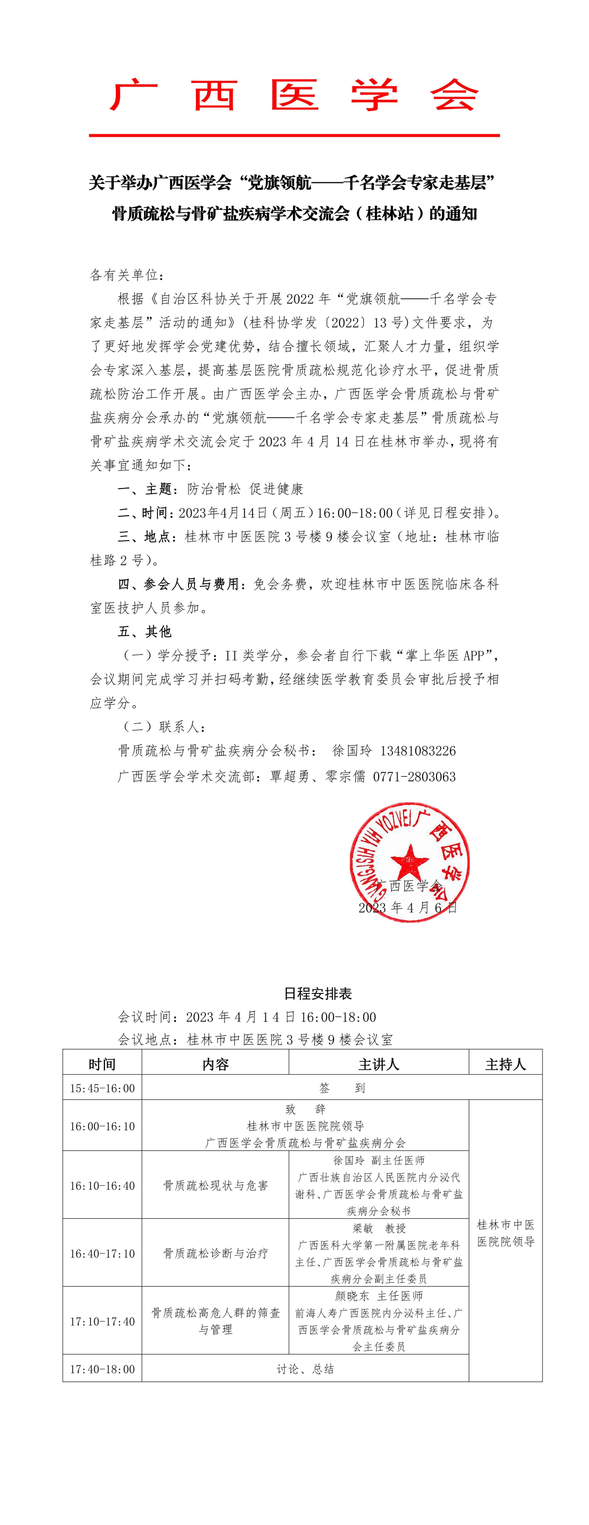 关于举办广西医学会“党旗领航——千名学会专家走基层” 骨质疏松与骨矿盐疾病学术交流会(桂林站)的通知