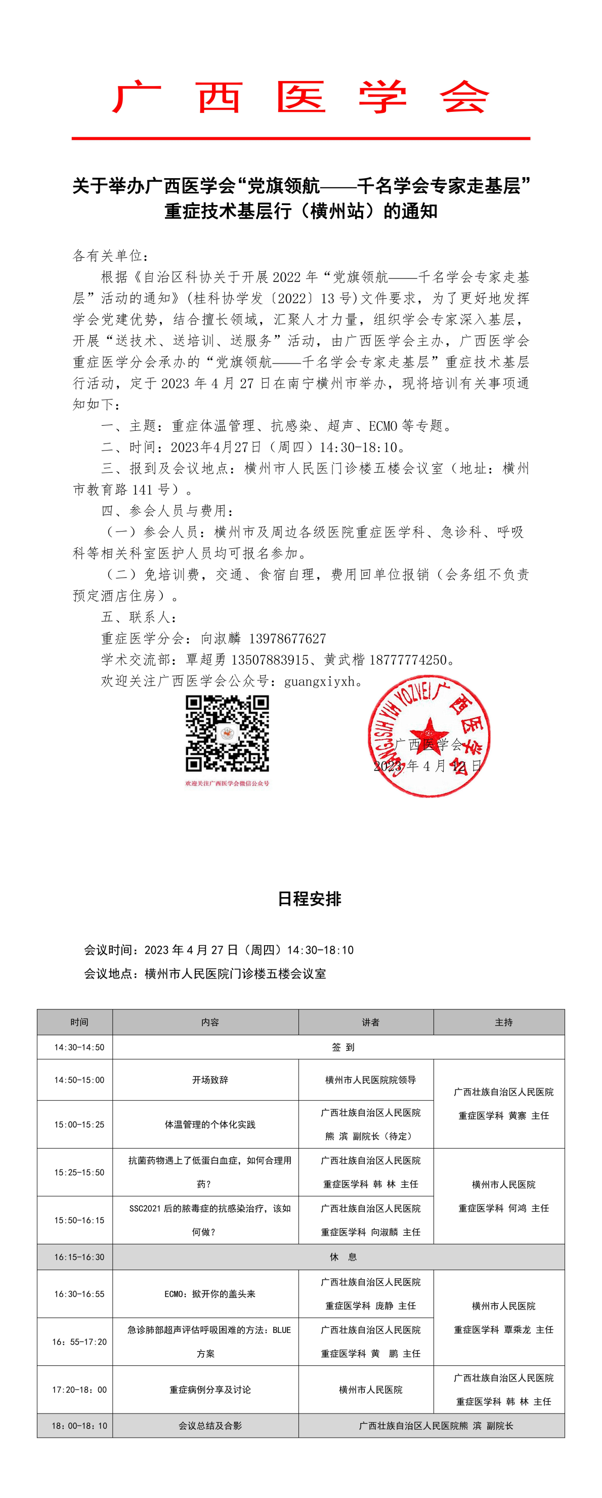 关于举办广西医学会“党旗领航——千名学会专家走基层” 重症技术基层行(横州站)的通知