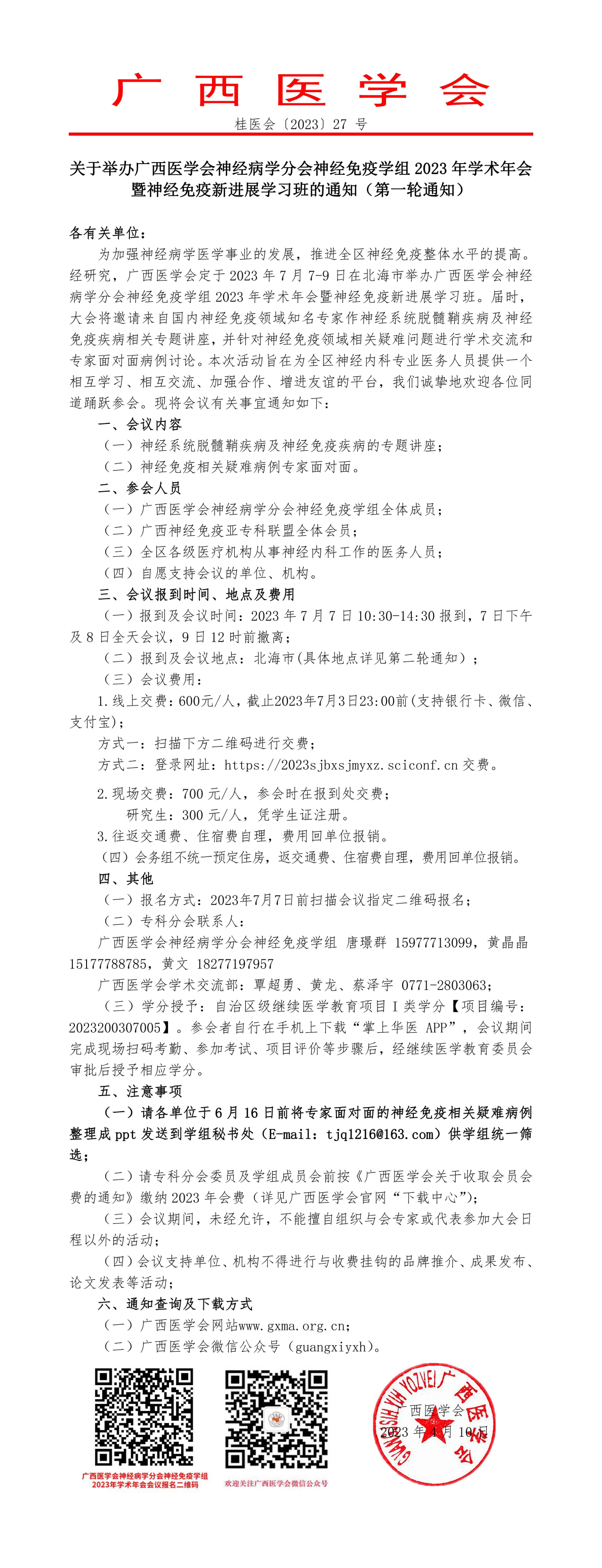 关于举办广西医学会神经病学分会神经免疫学组2023年学术年会暨神经免疫新进展学习班的通知(第一轮通知)
