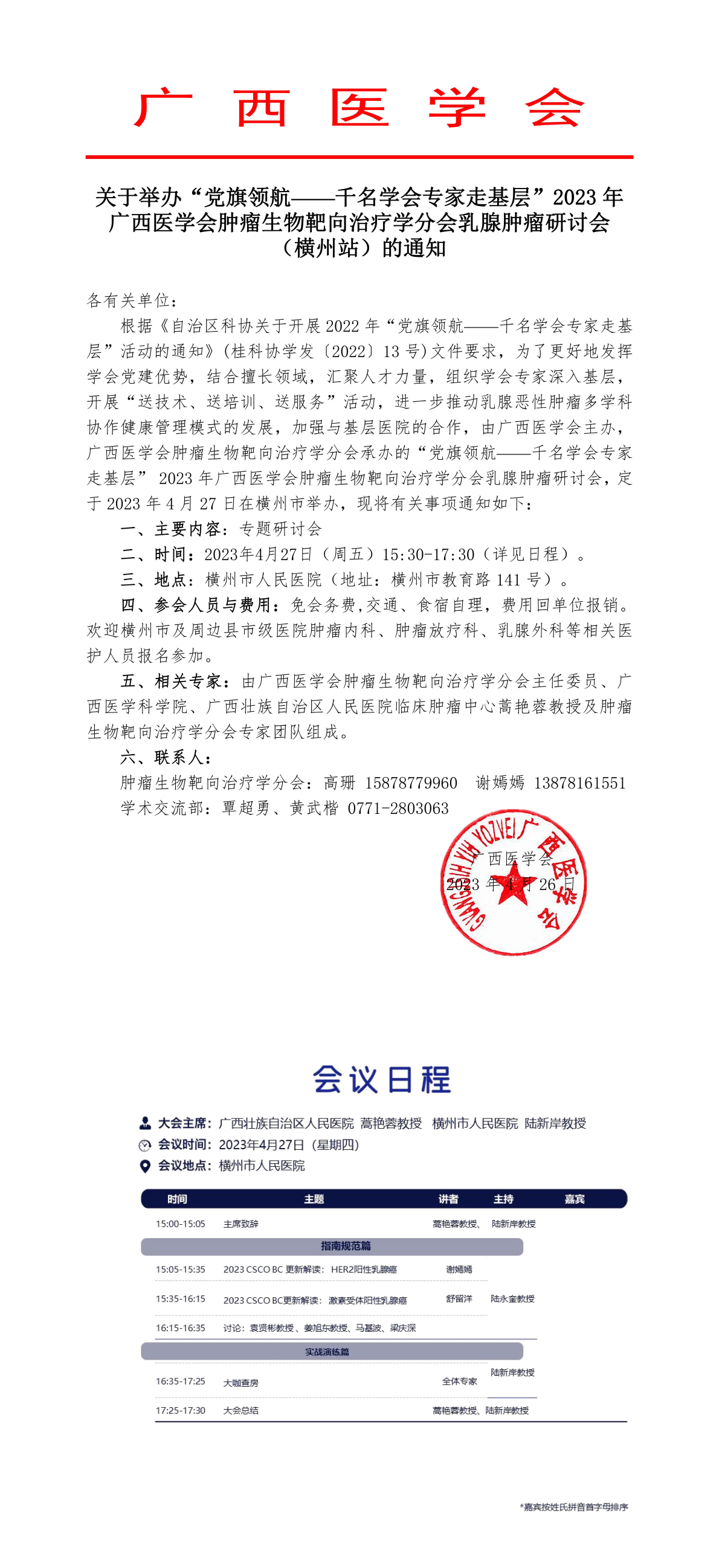 关于举办“党旗领航——千名学会专家走基层”2023年广西医学会肿瘤生物靶向治疗学分会乳腺肿瘤研讨会(横州站)的通知