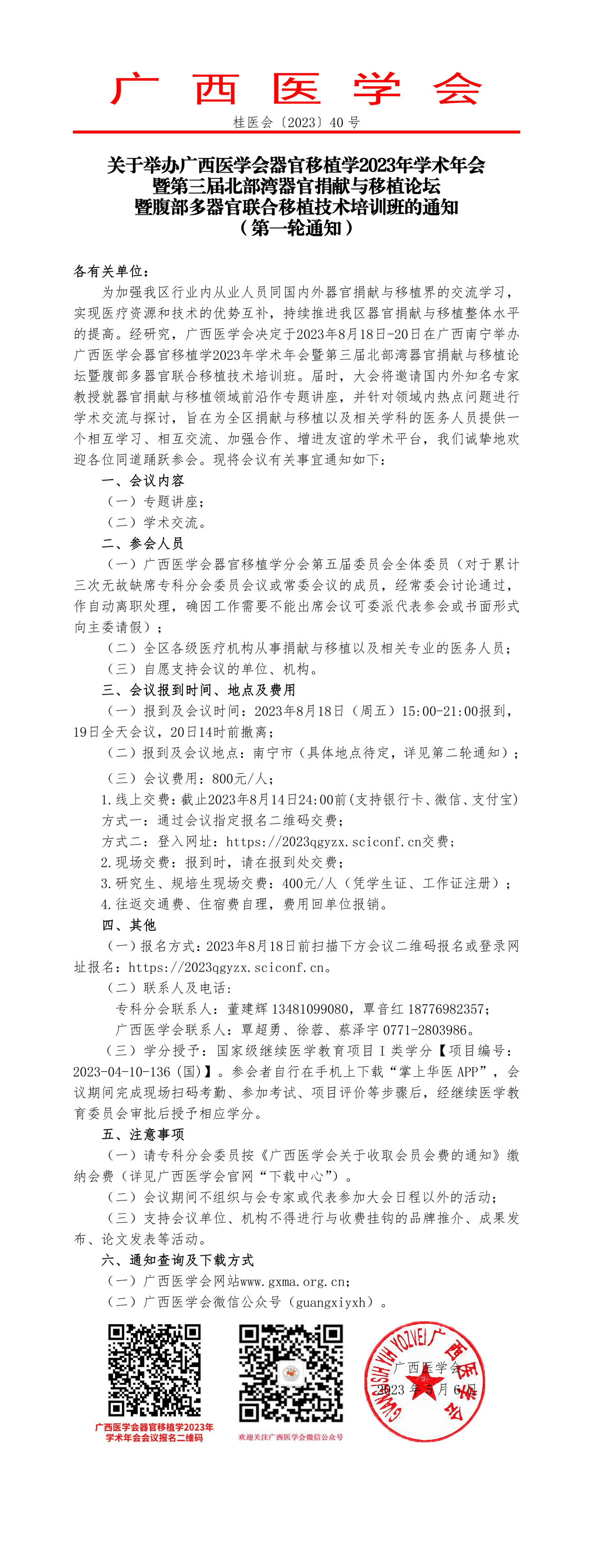 关于举办广西医学会器官移植学2023年学术年会暨第三届北部湾器官捐献与移植论坛暨腹部多器官联合移植技术培训班的通知(第一轮通知)